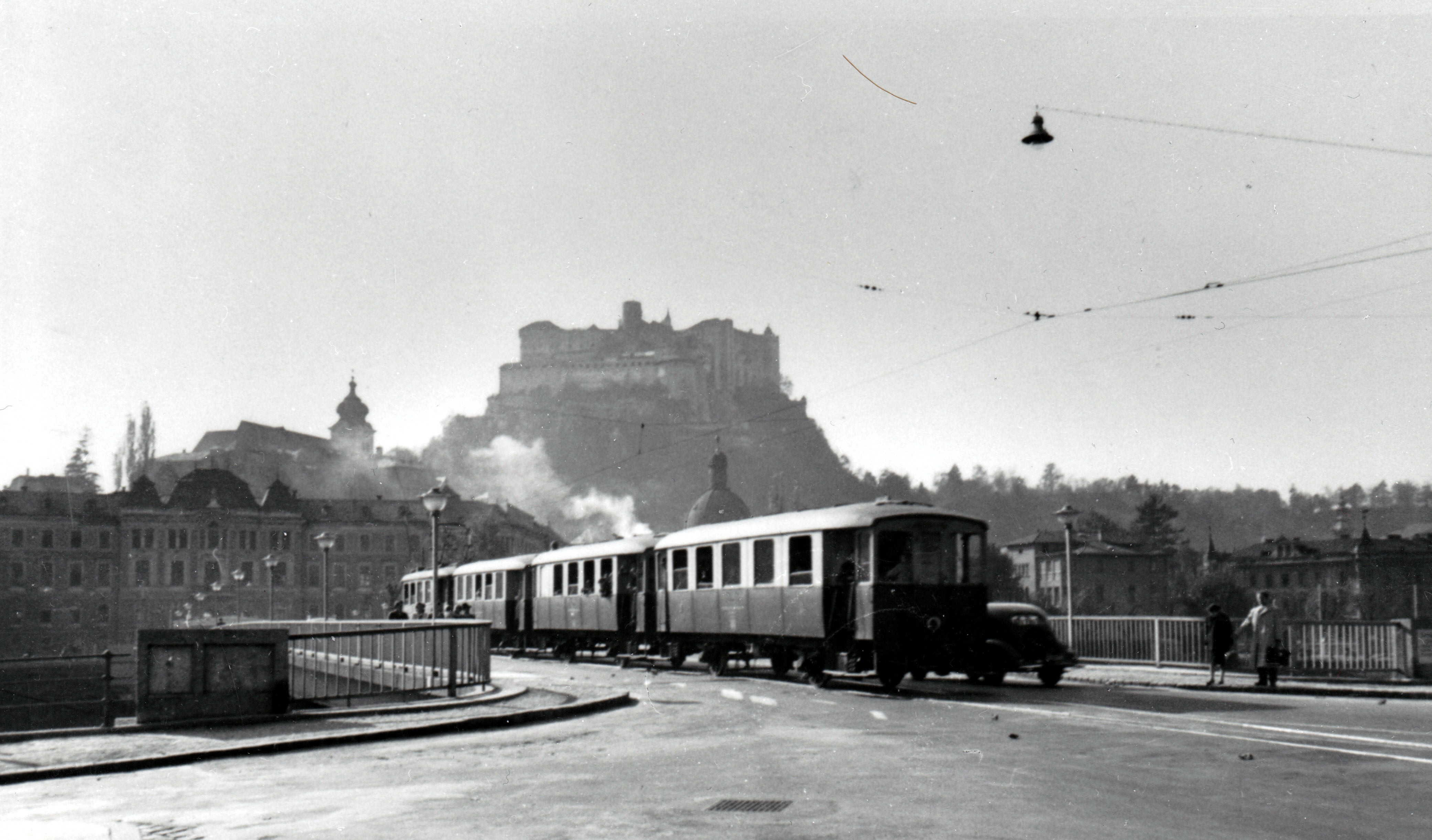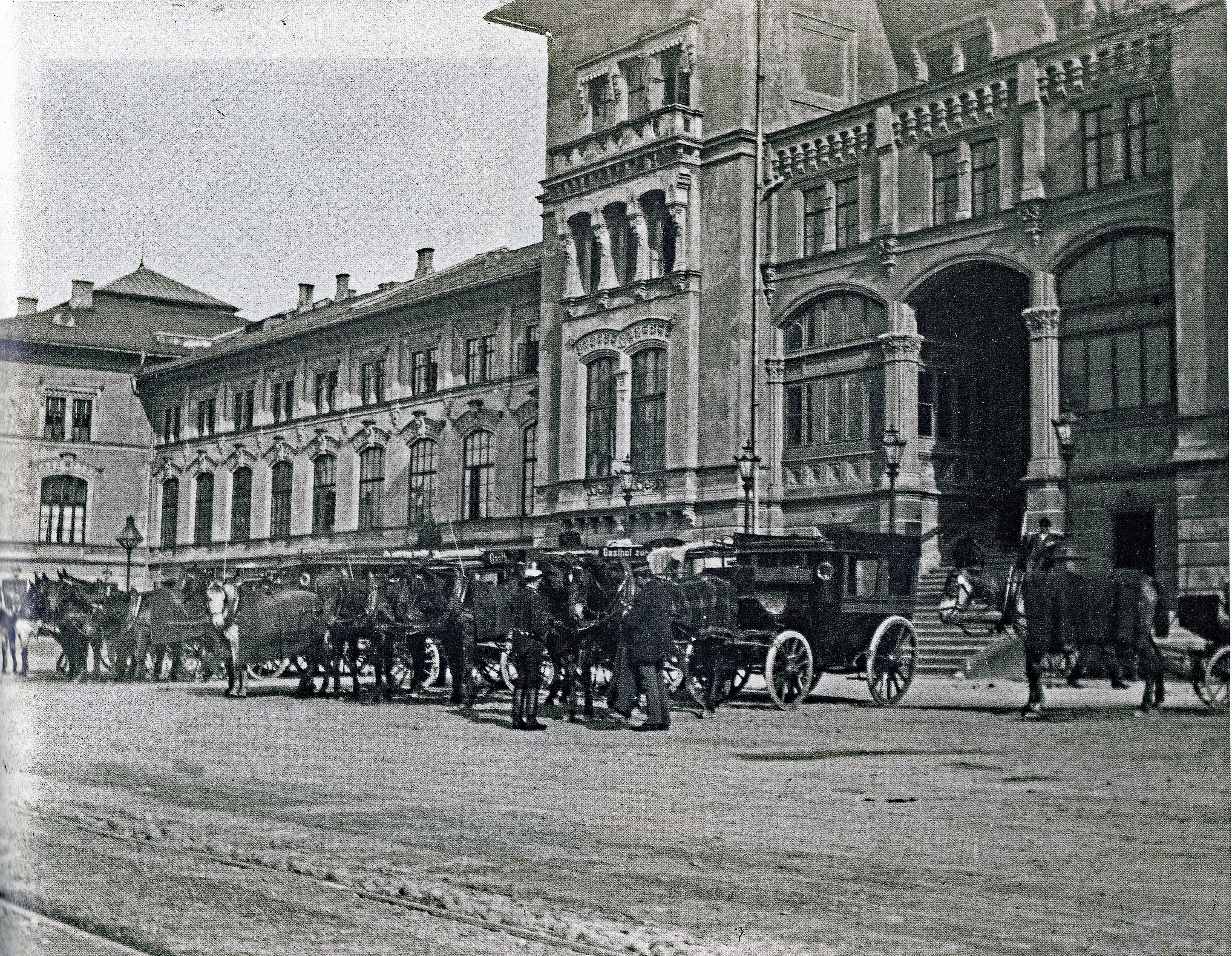 Carl von Frey - Salzburg Hauptbahnhof 13.3.1893. Pferdedroschken von Salzburger Hotels, sogenannte Hotelomnibusse, warten am Bahnhofsvorplatz, um die eintreffenden Gäste samt Gepäck in ihr Quartier zu bringen. Historischer Postbus der Marke Saurer in Christkindl. SETG Rote Elektrische Südlinien historische Fotos, Salzburger Lokalbahn durch die Stadt Richtung Königssee, Haltestelle Kiesel in der Rainerstraße.