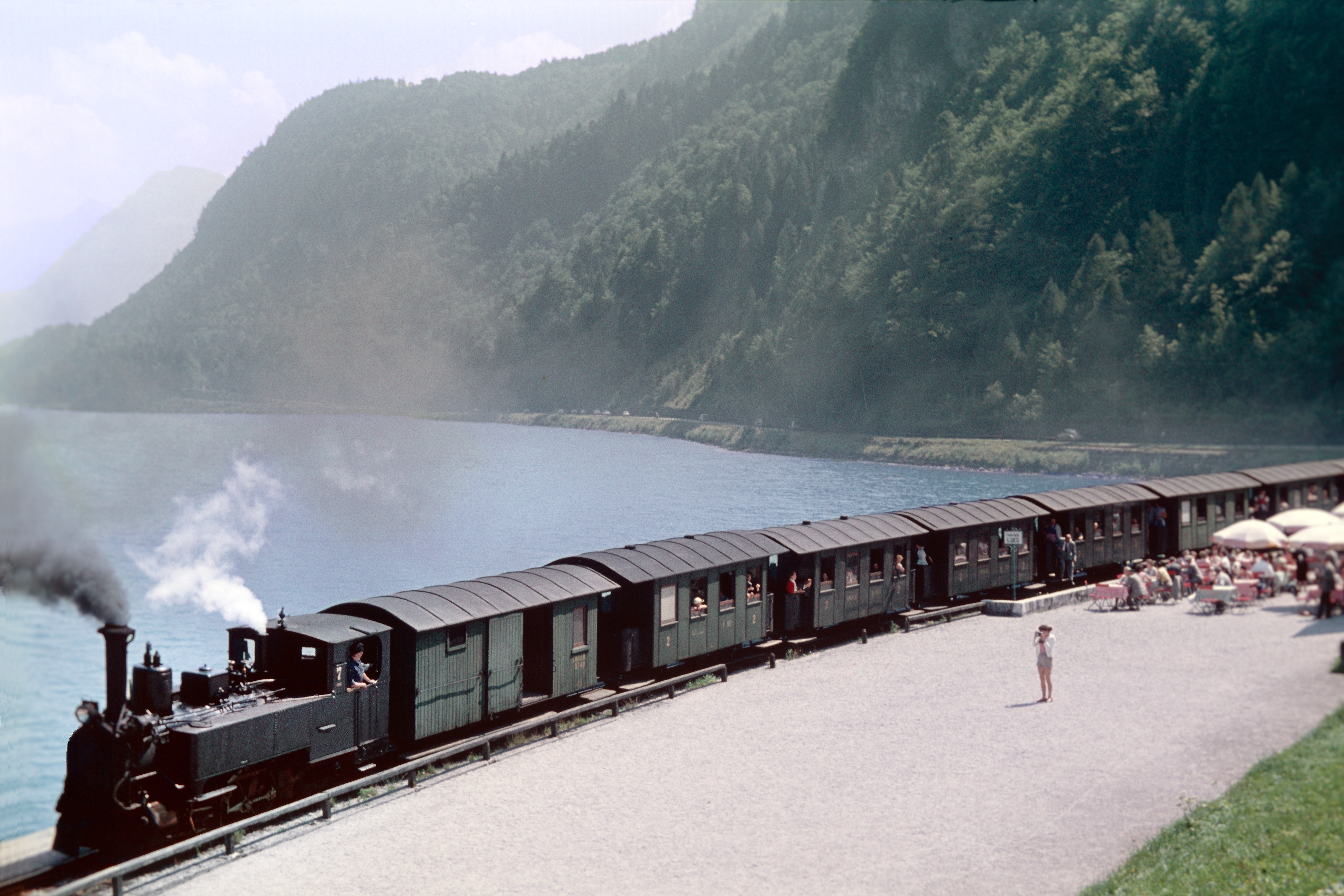 Historisches Foto von der Salzkammergut-Lokalbahn SKGLB - St.Gilgen. DI Harald Navé, Lueg, 2.8.1957. Lok 7. Postkarte, Österreichisches Nationalarchiv historische Fotos von der Salzburger Lokalbahn-Südlinie in schwarz-weiß