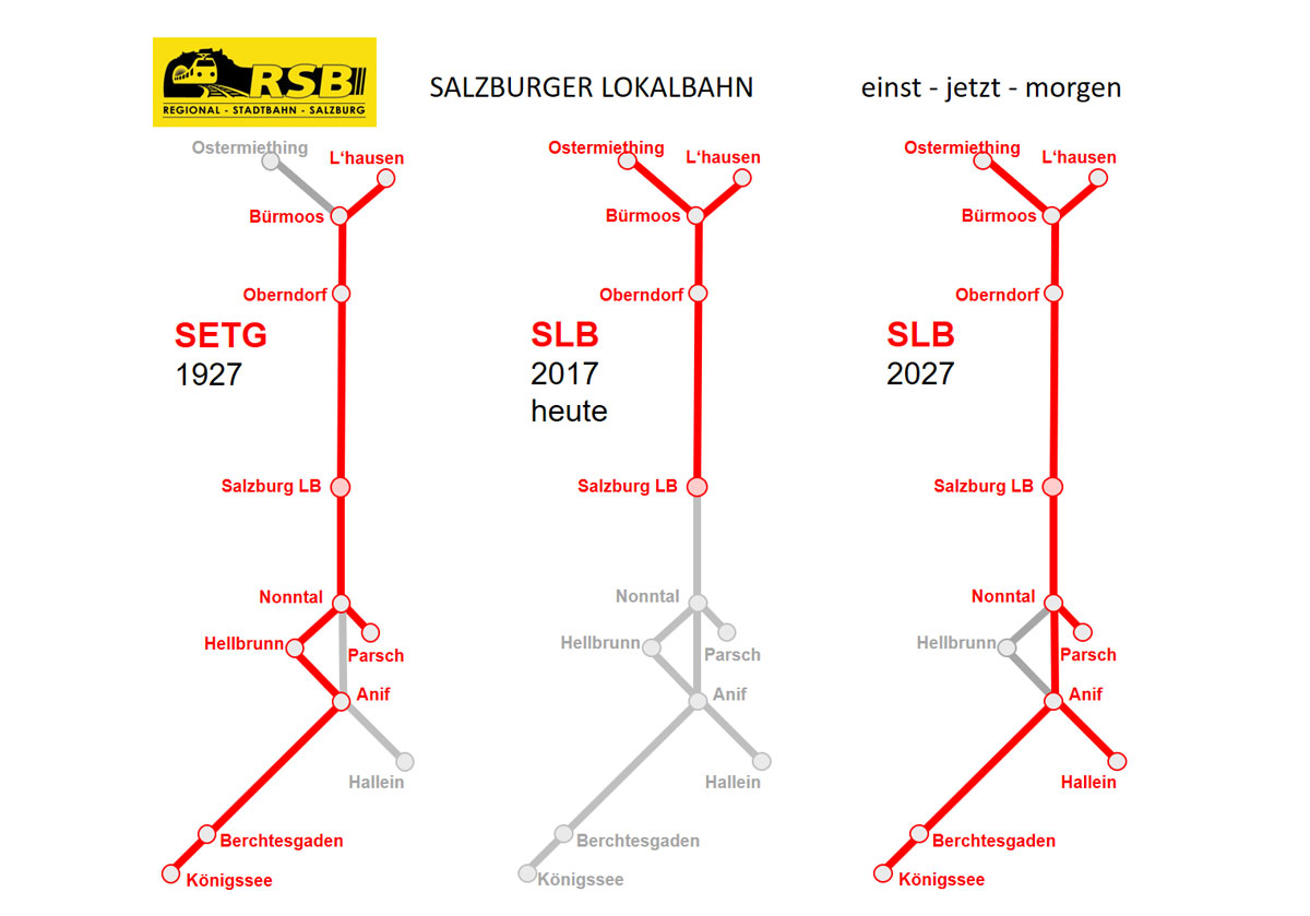 er Regionalbusverkehr wird, im Wesentlichen, in Österreich von ÖBB-Postbus und in Bayern vom RVO abgewickelt. In der Landeshauptstadt Salzburg werden 146,45 Kilometer Obusnetz von den SLB/Salzburg AG betrieben, die Dieselbus-/Gasbuslinien von Dr.Richard/Albus. Die Idee, Bestehendes verknüpfen, bedeutet, dass auf den Korridoren Richtung Stadt Salzburg Bahnlinien für den Regional-Stadtbahn-Betrieb adaptiert und mit dem Innenstadttunnel verknüpft werden.