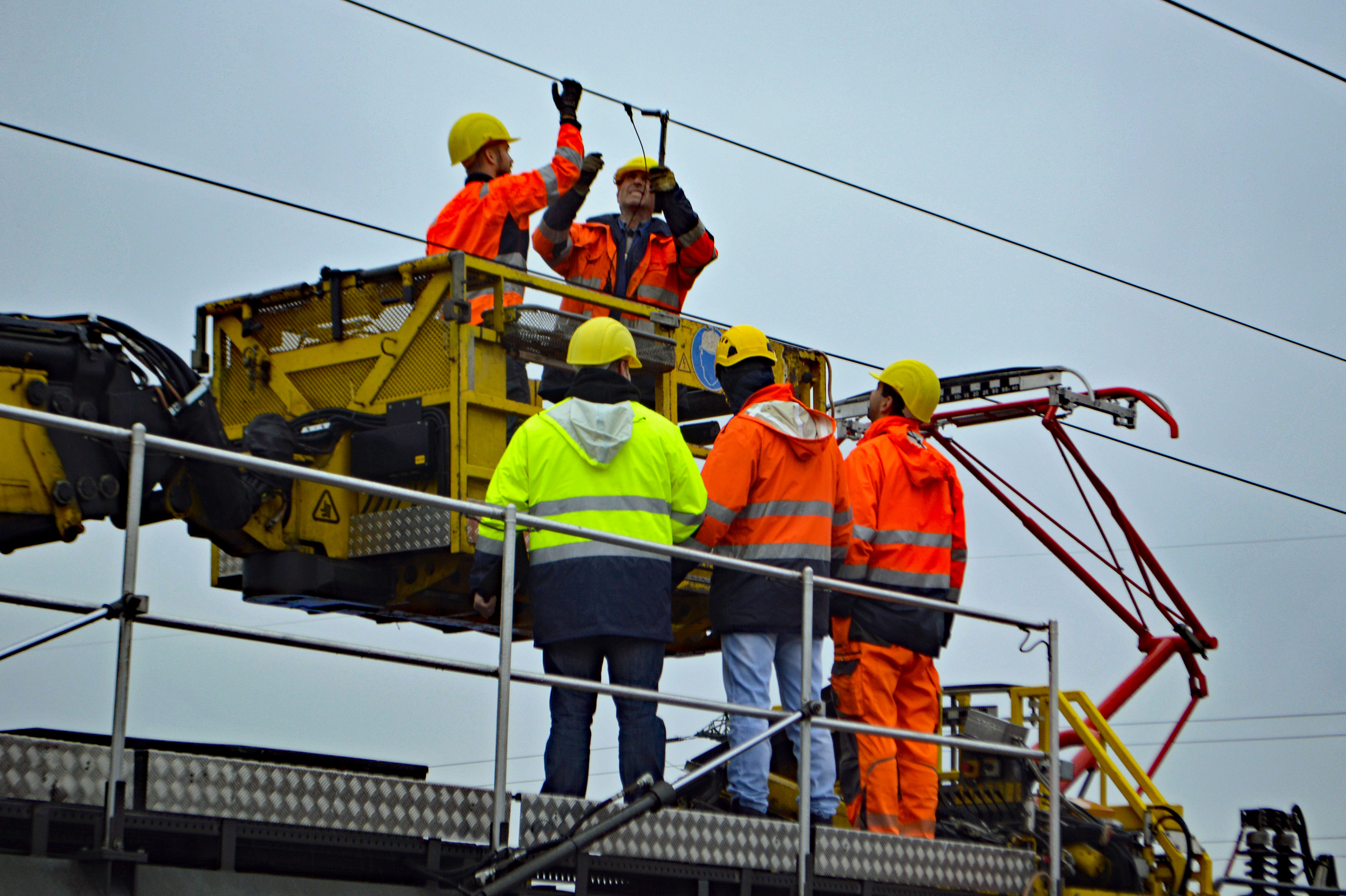 Fahrleitungsbau mit ÖBB-Turmtriebwagen im Bahnhof Steindorf. Hier fehlt noch die Fahrleitung, auch Oberleitung genannt, Richtung Mattigtal Braunau