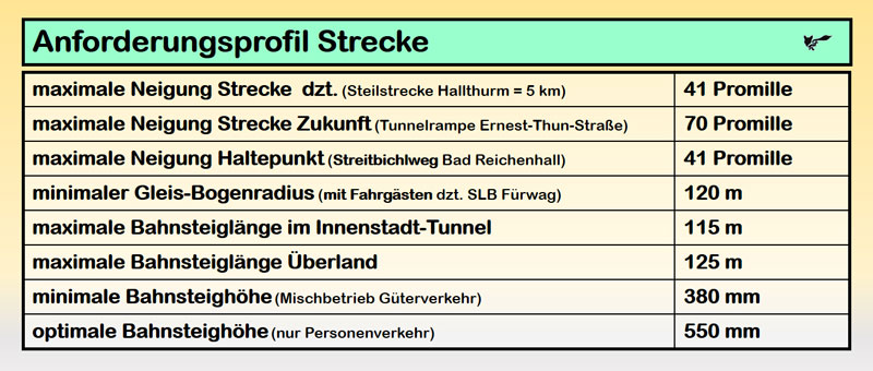 Zuerst wurde überlegt, welche Anforderungen in den Bergen der alpinen Regionen und damit im Zentralraum Salzburg an solche Fahrzeuge gestellt werden. So war sehr schnell klar, dass extreme Steigungen und nicht minder extreme Wintersituationen an die Fahrzeugkonstruktion höchste Ansprüche stellen. Diese Vorgaben von den Bahnstrecken im Zentralraum Salzburg sind in der folgenden Tabelle ersichtlich: