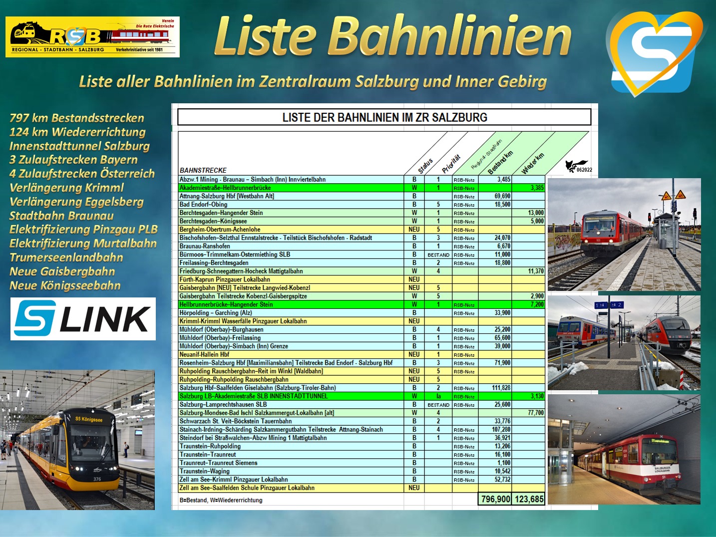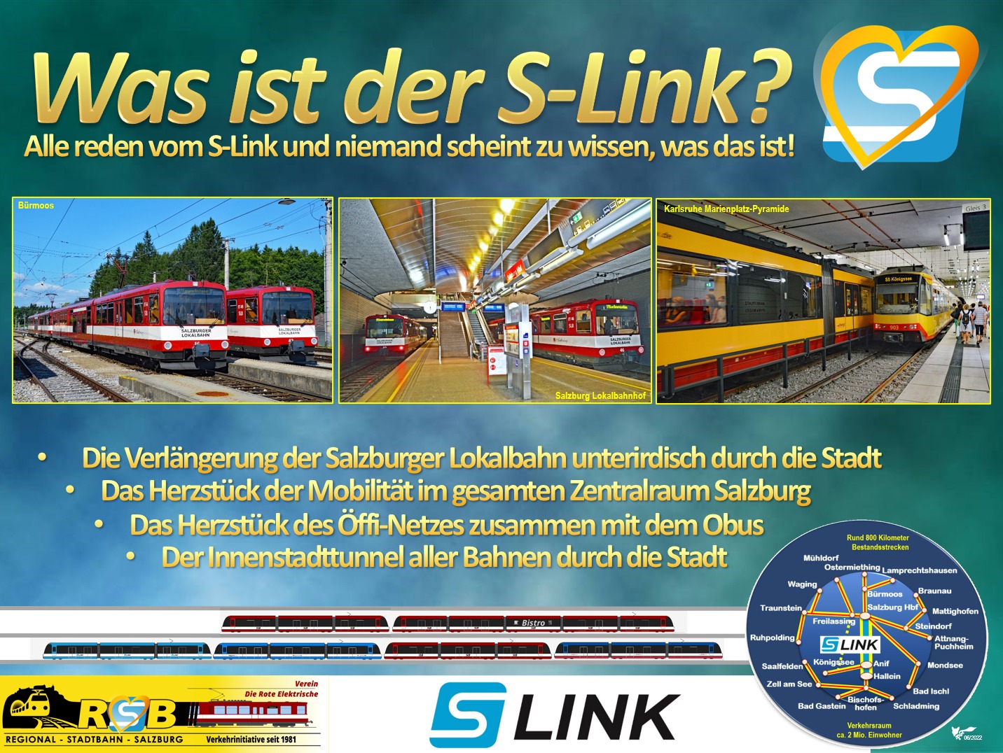 Im Verkehrsraum 70 Kilometer um Salzburg und Inner Gebirg wohnen 2 Millionen Menschen und existieren bereits jetzt fast 800 Kilometer Schienenbahnen. Zusammen mit dem S-Link-Innenstadttunnel und den Neubaustrecken Königsseebahn, Salzkammergut Lokalbahn neu, Trumerseenlandbahn etc. entsteht ein S-Bahn-Netz von knapp 1.000 Kilometer Streckenlänge. Zehn Linien ermöglichen die Mobilität dieser 2 Mio. Bürger und neun Linien davon fahren, im Viertelstundentakt in den S-Link-Innenstadt-Tunnel mitten ins, bzw, durch die Innenstadt der Welterbestadt Salzburg.