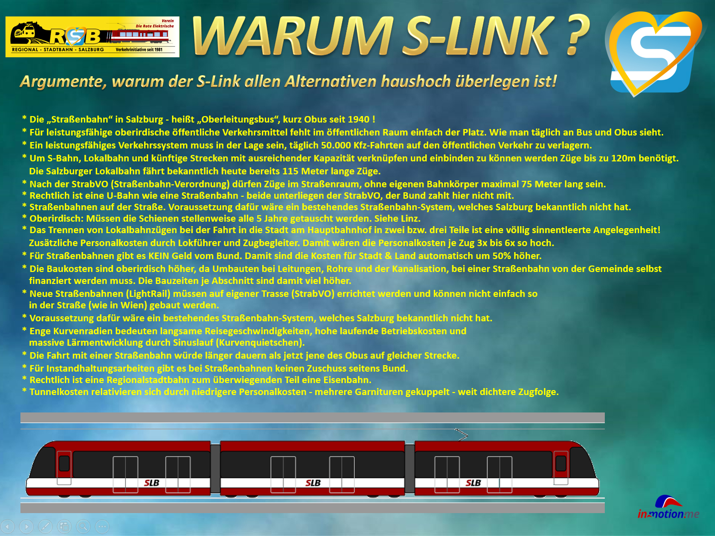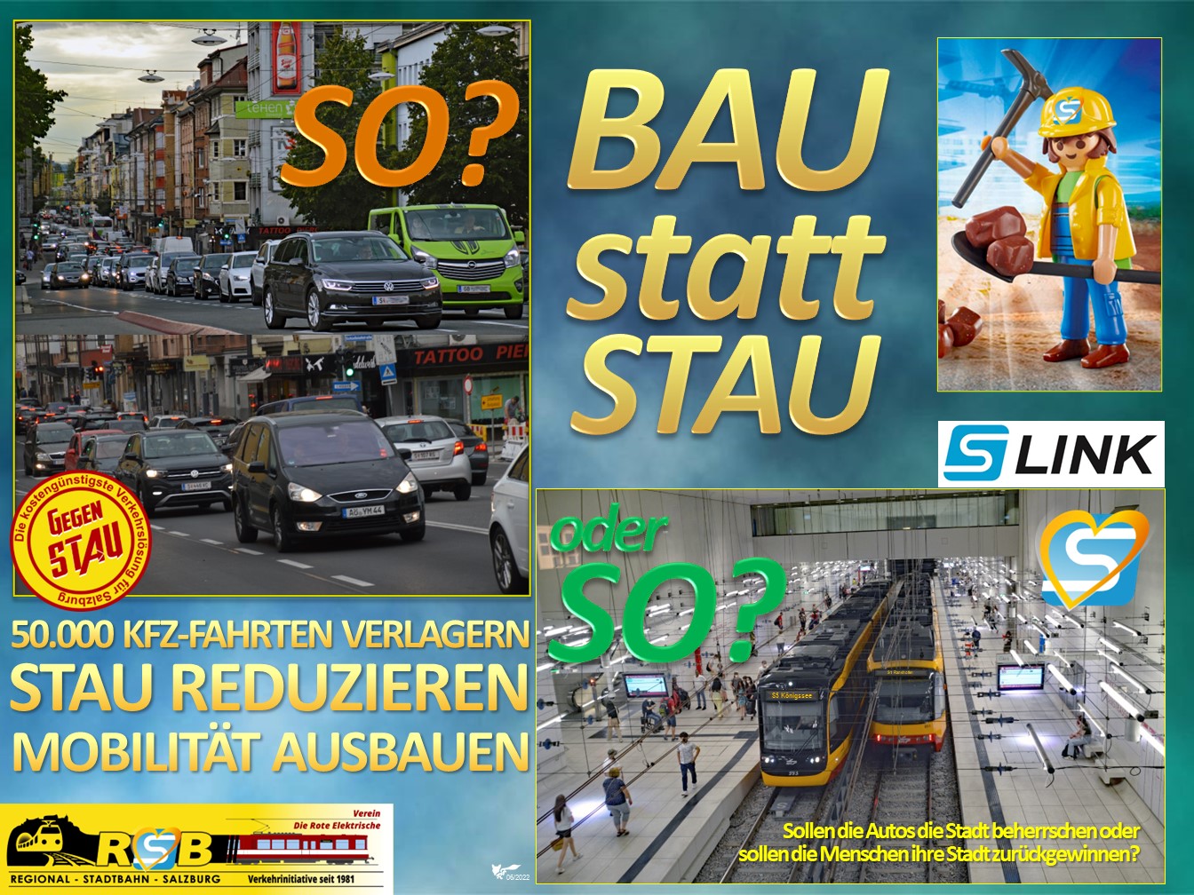 Die Stadt Salzburg wurde niemals für Automobile gebaut und erstickt in den engen Straßen im STAU. Aus diesem Grund muss eine Alternative geschaffen werden, die dem Welterbe-Gedanken und dem Stadtbild gerecht wird. Diese Alternative muss zudem auch leistungsfähig sein und die Verlagerung von rund 50.000 Pkw-Fahrten täglich möglich machen. Das ist nur mit einer leistungsfähigen Regionalstadtbahn, dem "S-Link", mit einer mittleren Reisegeschwindigkeit von 42 km/h teilweise unter der Stadt möglich. Nur so kann die umweltgerechte Verlagerung des Verkehrs vom Auto auf den öffentlichen Verkehr tatsächlich stattfinden!