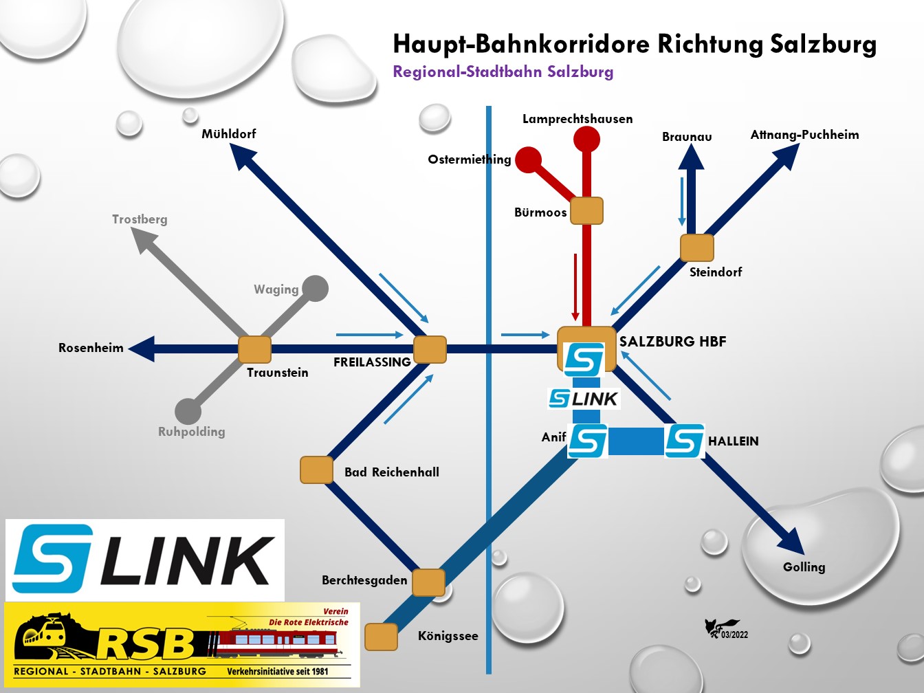 Will man bestehende elektrisch betriebene ÖPNV-Systeme in ein leistungsfähiges alternatives Schienenverkehrs-Netz verwandeln, muss man sich Gedanken machen, welche Bestands-Systeme es bereits gibt. In der Stadt Salzburg existiert der abgasfreie umweltfreundliche Obus, dessen Netz an das Regionalstadtbahn-Netz, "S-Link" genannt, angepasst werden muss! Derzeit laufen bereits sieben Bahnkorridore auf Salzburg zu, drei aus Bayern und vier aus Österreich. Durch das eliminieren der vordem bestehenden Schienenstrecken Lokalbahn-Südlinien (zerstört 1953) und Salzkammergut-Lokalbahn (zerstört 1957) fehlen heute leistungsfähige Schienenkorridore, die eine Verlagerung von der Straße auf die Schiene erst möglich machen. Diese leistungsfähigen Schienenkorridore heißen "S-Link" und "Königsseebahn" .