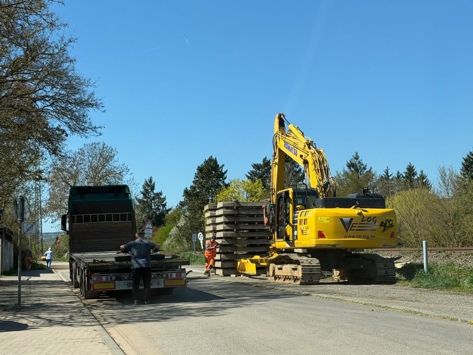 Wie angekündigt begann gestern die Sanierung des Abschnitts Langenlonsheim-Stromberg. Die ersten Schwellen wurden in Klonigersmühle und Schweppenhausen angeliefert. Ein Trupp ...