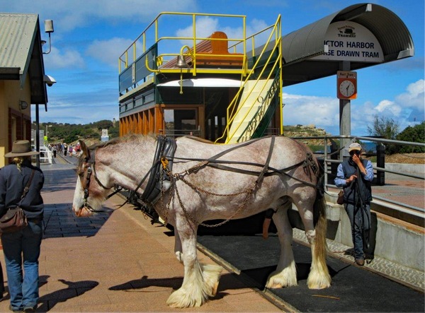 Victor Harbor, eine Kleinstadt mit ca. 10.000 Einwohnern verfügt über einen städtischen Pferdebahnbetrieb der rund um das Jahr, täglich für die Verbindung vom Bahnhof über eine 630m lange Holzbrücke zum Granite Island sorgt.