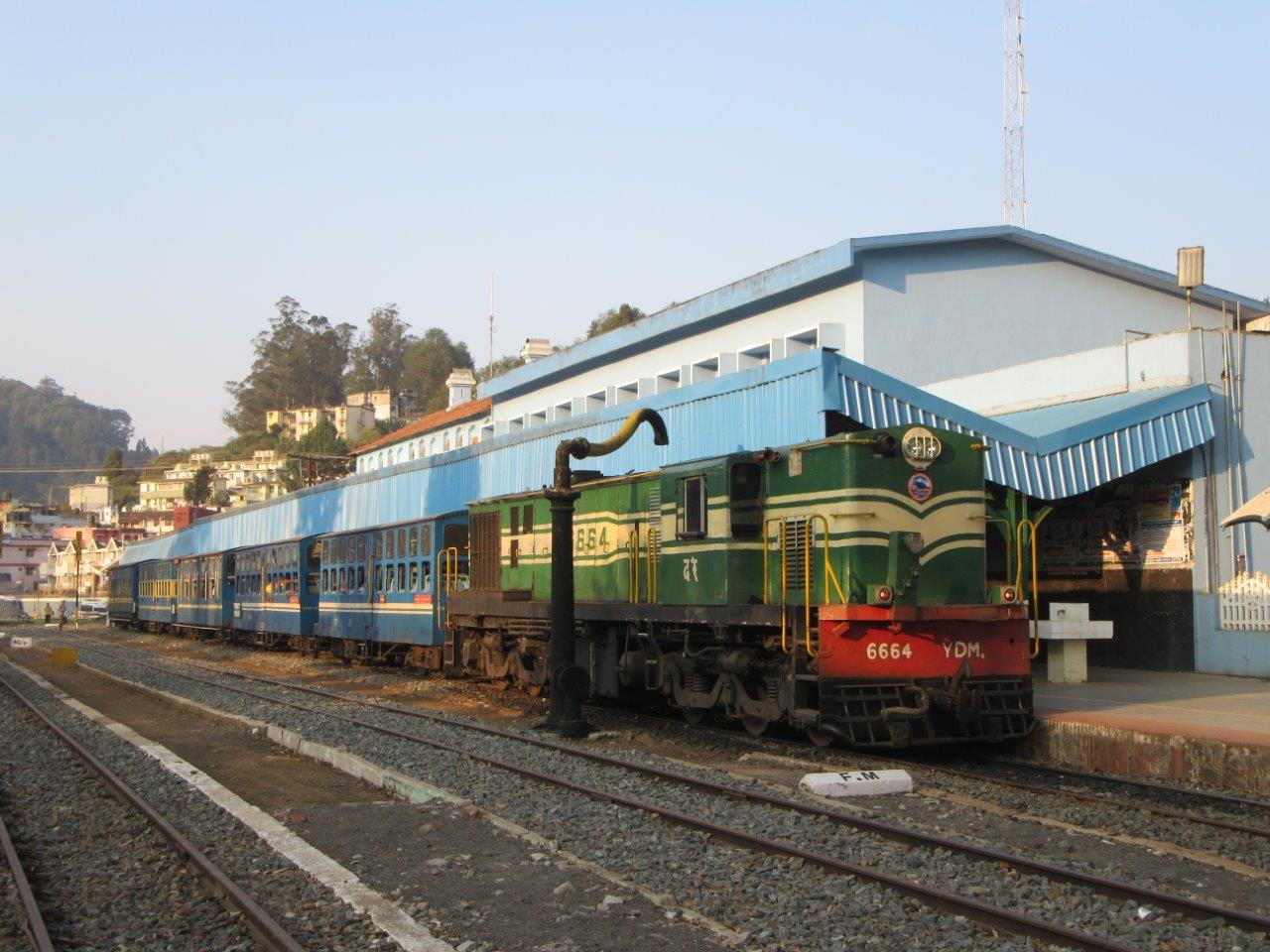Zahnradbahn als UNESCO Welterbe, Nilgiri Mountain Railway, Flachstrecke, YDM-4 Lok 6664 abfahrbereit im Endbahnhof Udagamandalam (Ooty) in Richtung Coonoor.