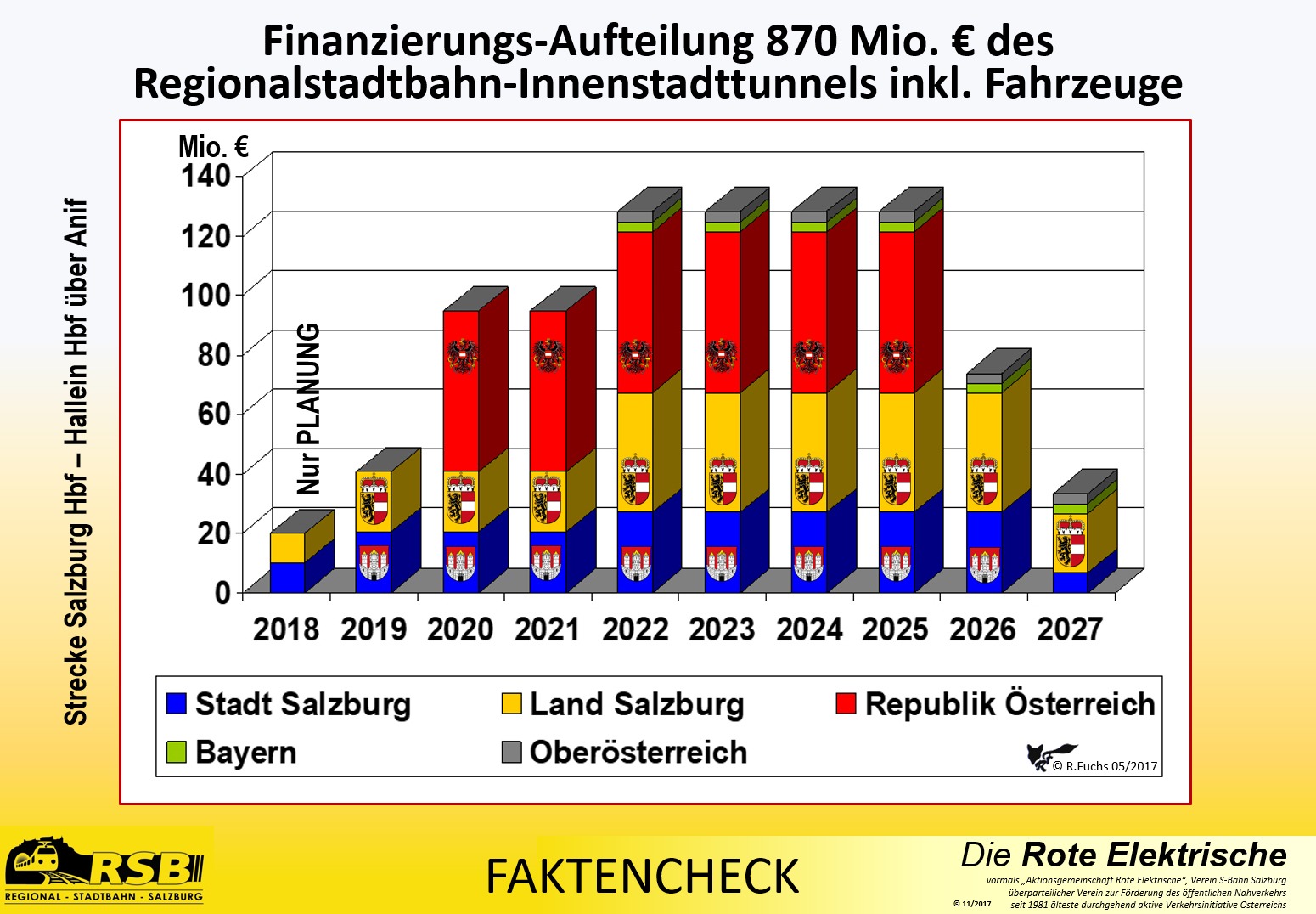 Der Innenstadttunnel der Lokalbahnverlängerung durch die Stadt und oberirdisch weiter bis Hallein, hat nach heutigem Stand ein Kostenvolumen von rund 600 Millionen Euro. Diese 600 Millionen werden vom Bund, über das MIP, zur Hälfte finanziert. Die andere Hälfte teilen sich über 10 Jahre Stadt und Land Salzburg, was jeweils einen jährlichen Anteil von 15 Millionen Euro bedeutet.