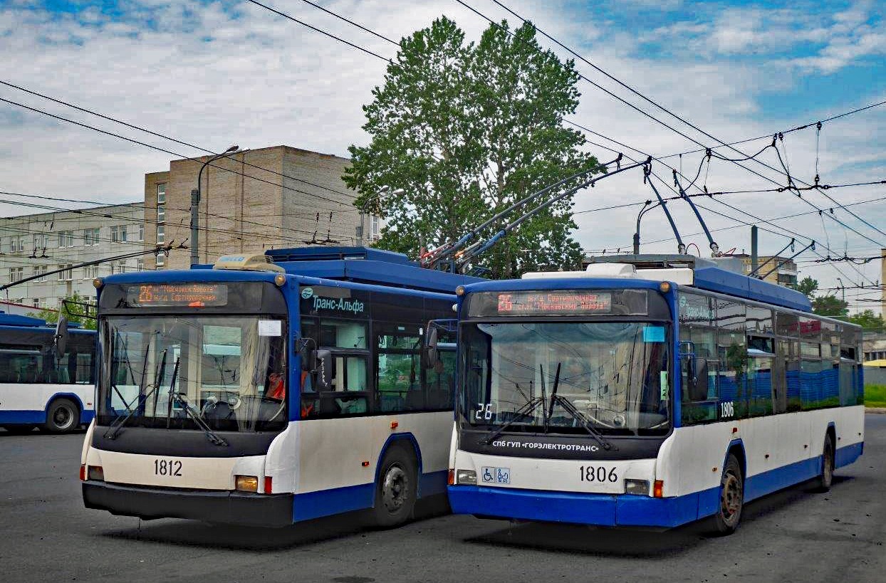 St. Petersburg Obusse, Zwei Trans Alpha VMZ 5298.01 - 1812 (Baujahr 2007) und 1806 (Baujahr 2006) warten auf die Abfahrt zur Linie 26 in Frunzenskiy.