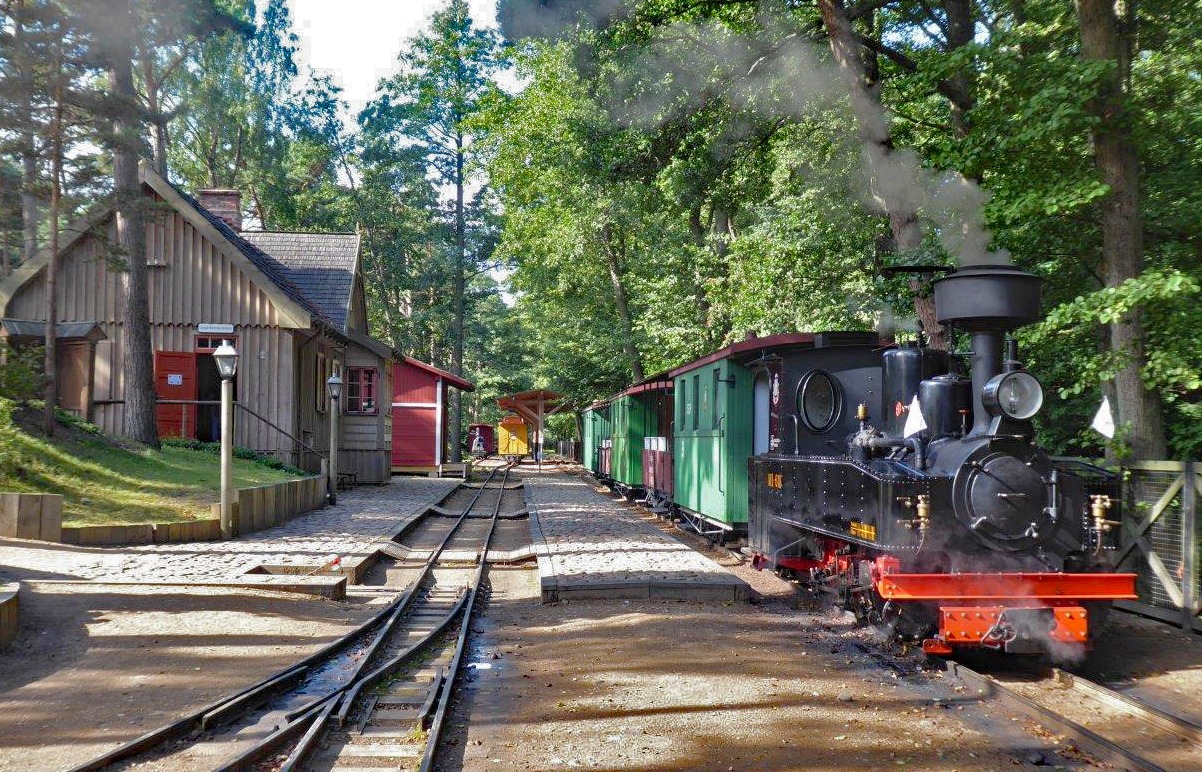 Ventpils/Windau - 600mm Paradies in Kurzeme Lettland, Eine Idylle – der „Hauptbahnhof“ des Freilichtmuseums in Ventpils/Windau mit dem abfahrbereiten Zug, gezogen von Lok M 611.