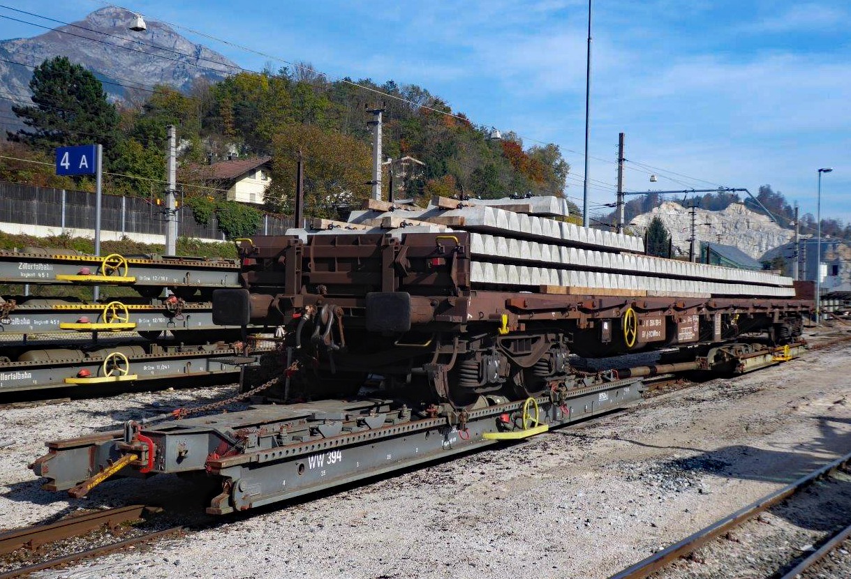 Umfangreiche Bauarbeiten im Bahnhof Jenbach der Zillertalbahn führten in der 2. Oktoberhälfte 2019 zu einem kurzen Revival das Rollwagenbetriebes. Die Normalspurwaggons mit den neuen Betonschwellen wurden aufgeschemelt und zur Baustelle rangiert. Ein inzwischen (leider) seltener Anblick – findet doch aktuell in Österreich kein planmäßiger Rollwagenbetrieb mehr statt.