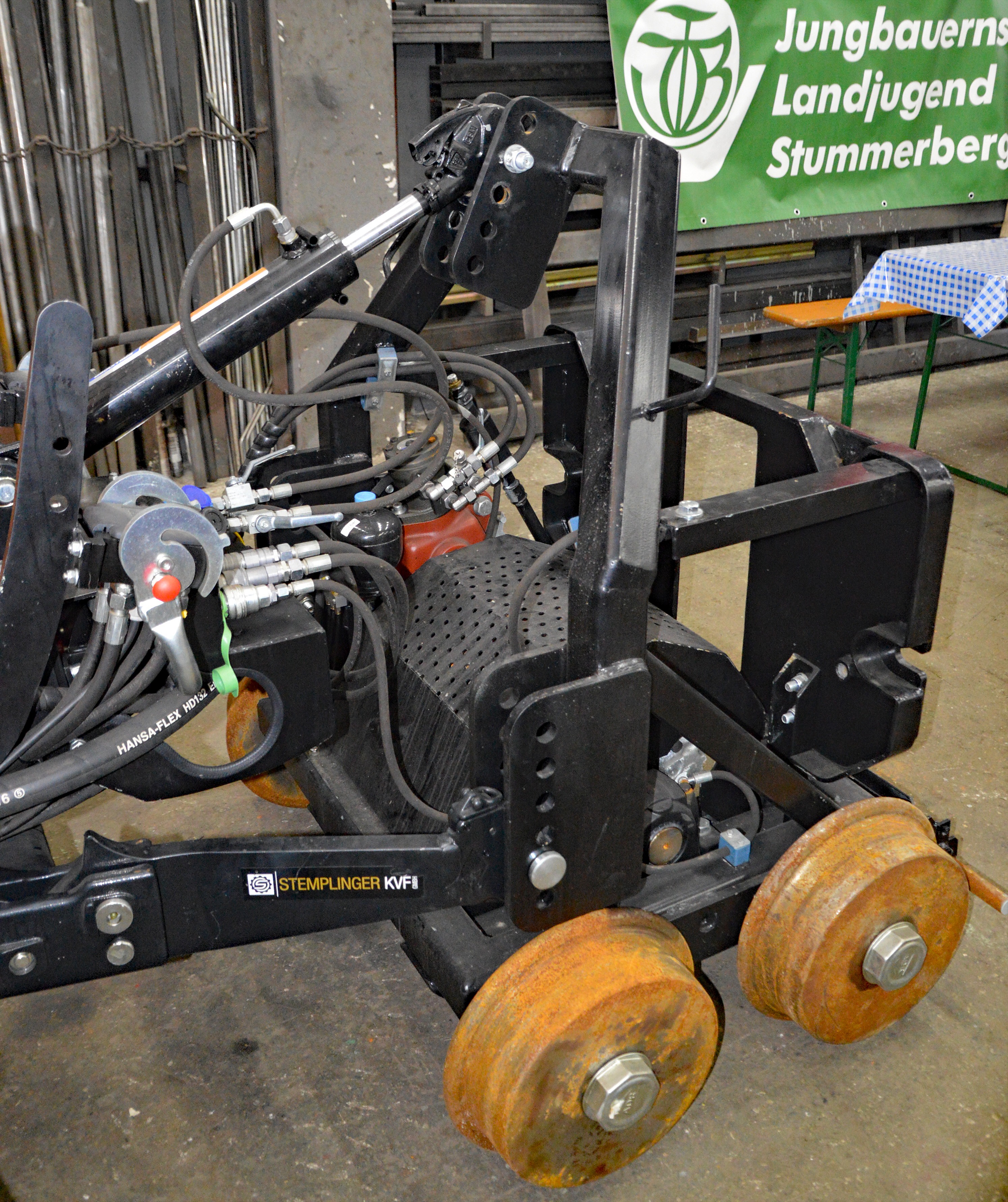 Das meterspurige Antriebswägelchen mit Zahnradantrieb ist ein Mehrkomponententräger, der mittels Hydraulikleitungen Mähbalken, Kräne und Anhängewagen für Bäume und andere Komponenten für diverse Aufgaben aufstecken kann, eben ein "Schweizer Messer".