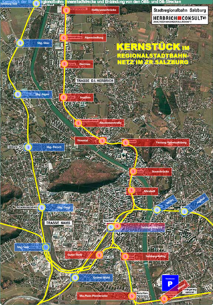 Der "Arbeitskreis Regionalstadtbahn Salzburg" unter Dr. Horst Schaffer 2005 empfahl die Variante "1c kurz" als die effizienteste Innenstadt-Durchfahrt der Regionalstadtbahn durch Salzburg. Auf dem Satelliten-Plan sind die Lokalbahnhaltestellen rot unterlegt und die auf den Bundesbahnstrecken in blau. Satellitenplan von DI Rainer Herbrich