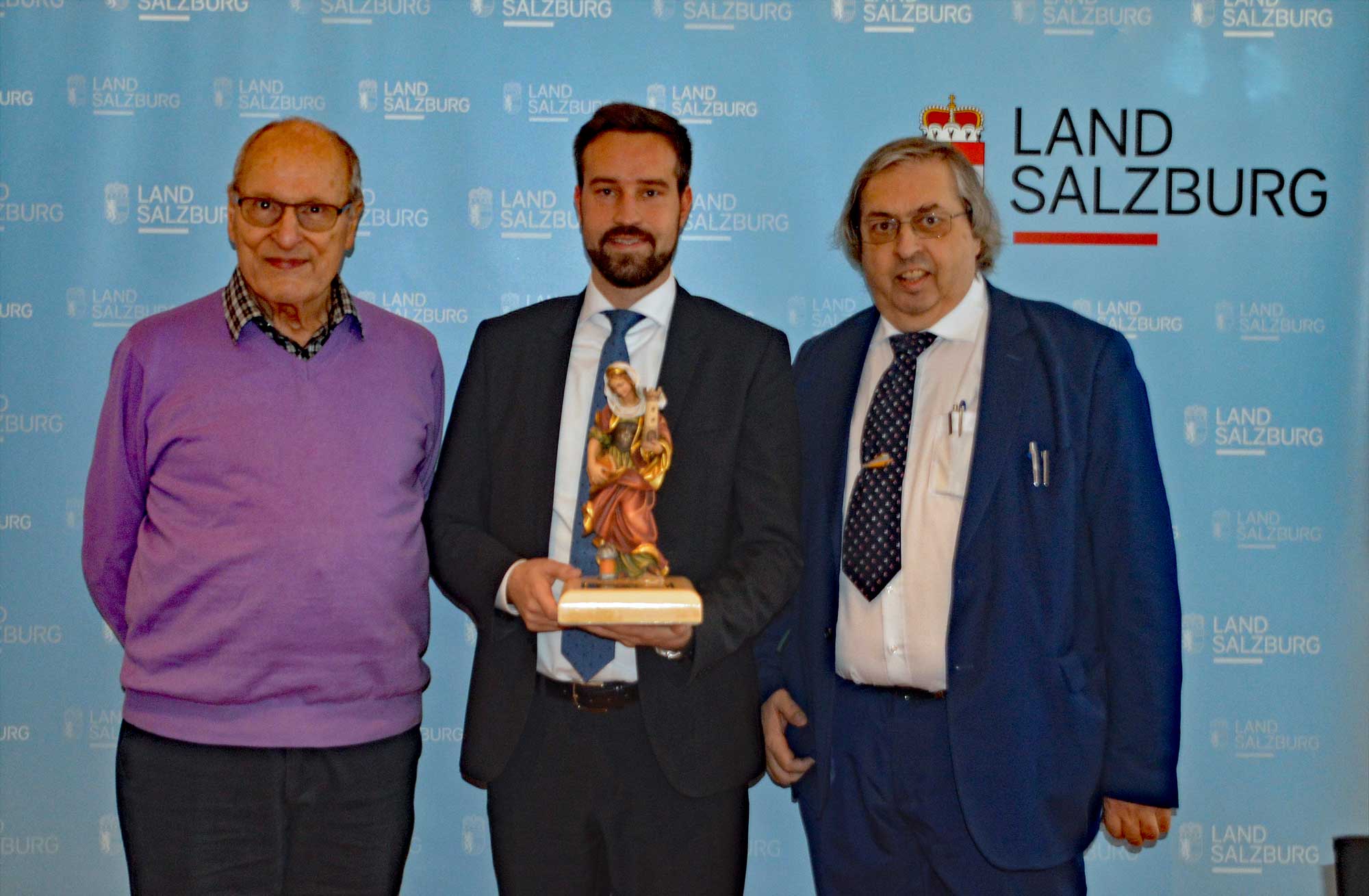 Für den Verein „Die Rote Elektrische“ überreichen Obmann Richard Fuchs und Schriftführer DI (FH) Erwin Pamp die Barbarastatue am 4.2.2020 an Landesrat Mag. Stefan Schnöll in seinem Büro für den endgültigen Aufstellungsort in der unterirdischen Regionalstadtbahnstation „Mirabell“.
