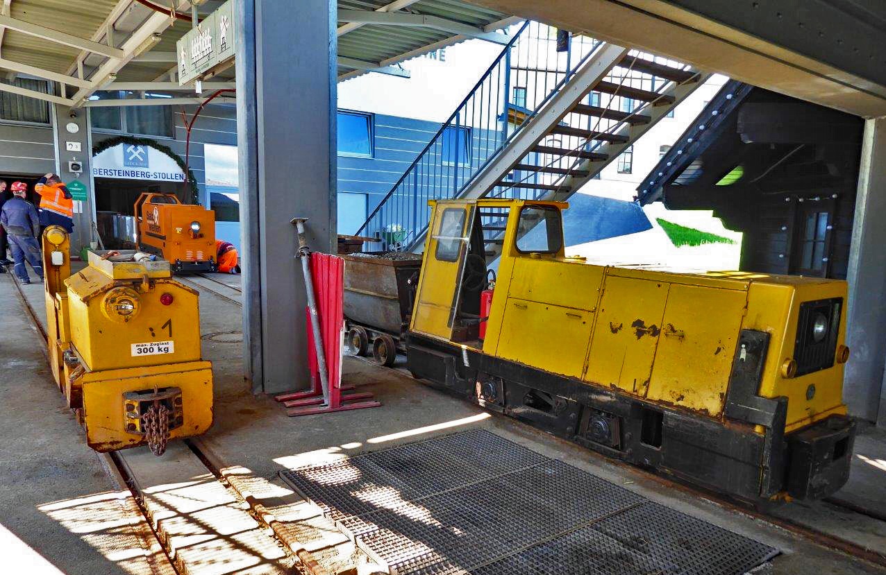 Grubenbahn am Halleiner Dürnberg, Hochbetrieb am Obersteinbergstollen, links die Clayton Akku Lok 1, rechts die Leihlok aus Bad Ischl und im Hintergrund die von Tecsol ertüchtigte Elin Akku Lok.