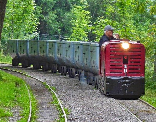 Kohlenbahn-Bahnhof Scheiben , Die Akkulok vom Typ GA1 (AEG/1949) erinnert am Mundloch des Giselastollens in Geboltskirchen an die seinerzeitigen Grubenbahnen.