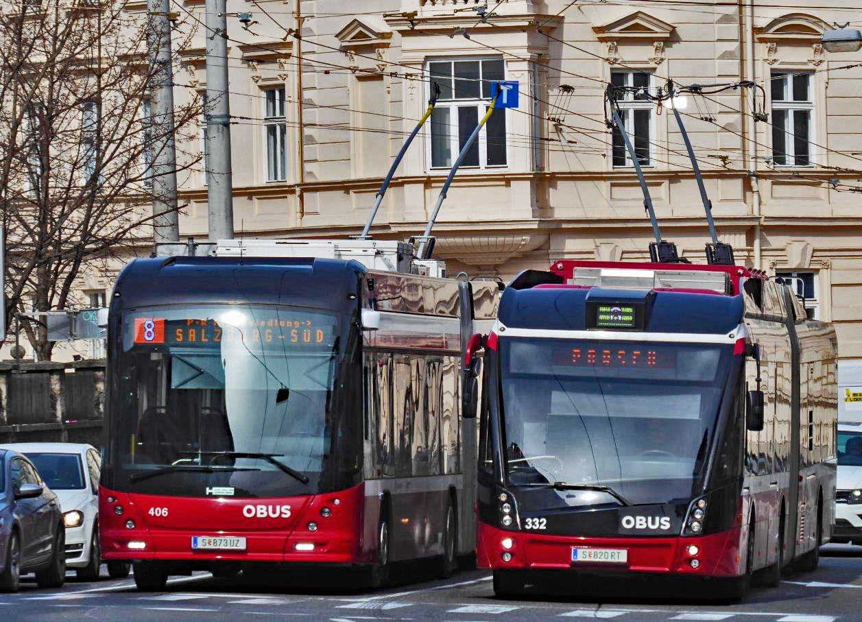 Obus 406 (Hess / ABB, 2019) auf Linie 8 und Obus 332 (Solaris / Cegelec, 2014) auf Linie 6 nebeneinander auf Rudolfskai