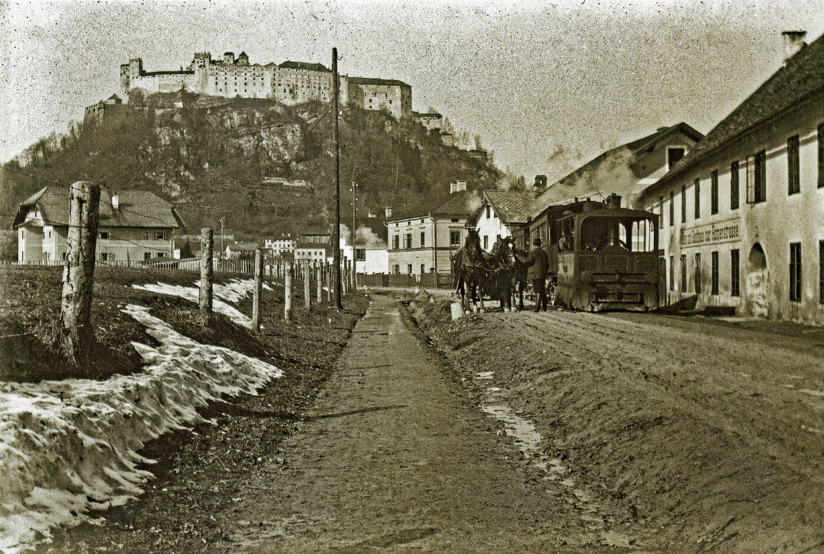 Würthle & Co. 1907. Bereits 1887 gab es Pferdebahnbetrieb Bahnhof bis Bazar. Ab 1892 betrieb die SETG eine Pferdebahn vom Bahnhof über die Schwarzstraße auf den Residenzplatz und nach Nonntal. 1908 wurde der Pferdebahnbetrieb eingestellt.