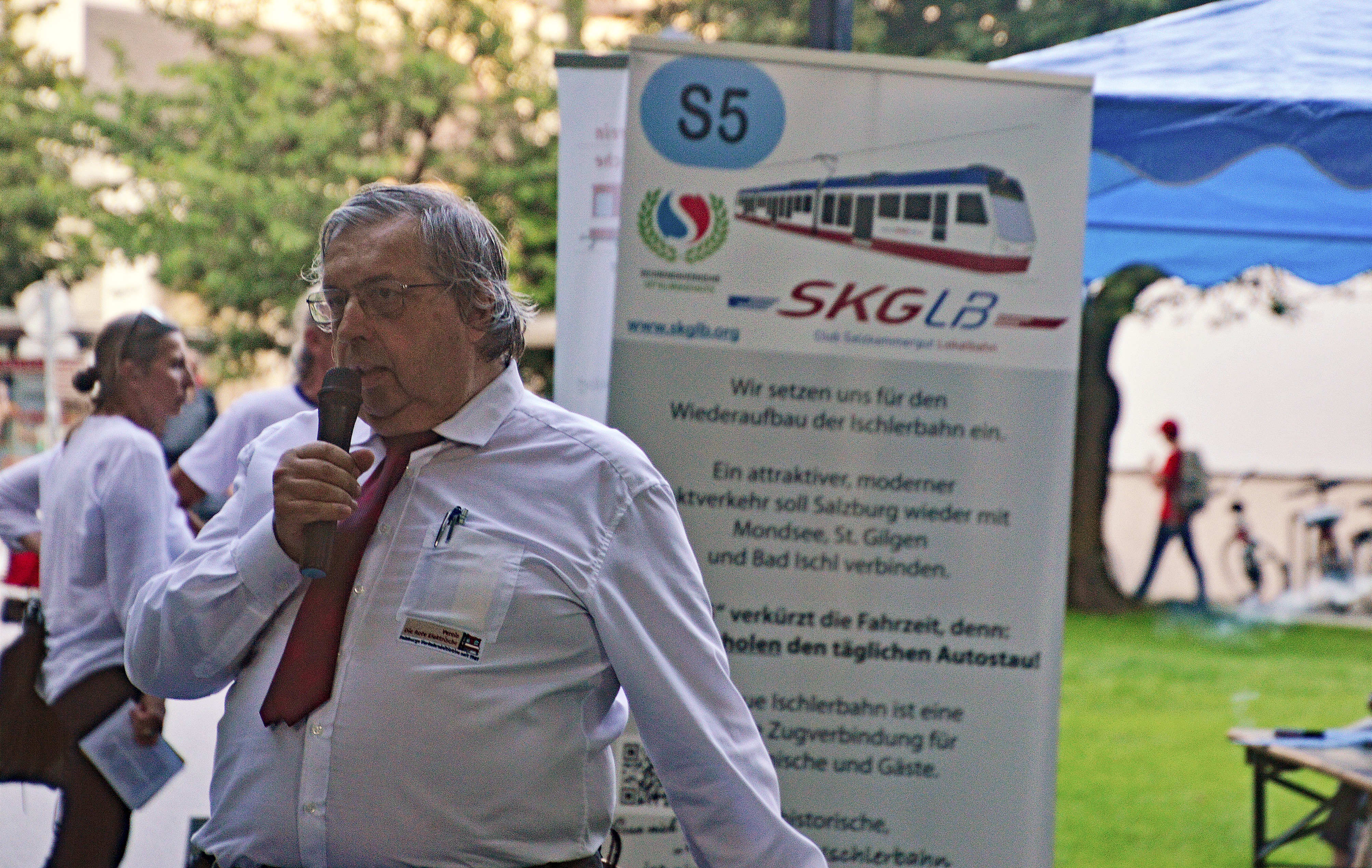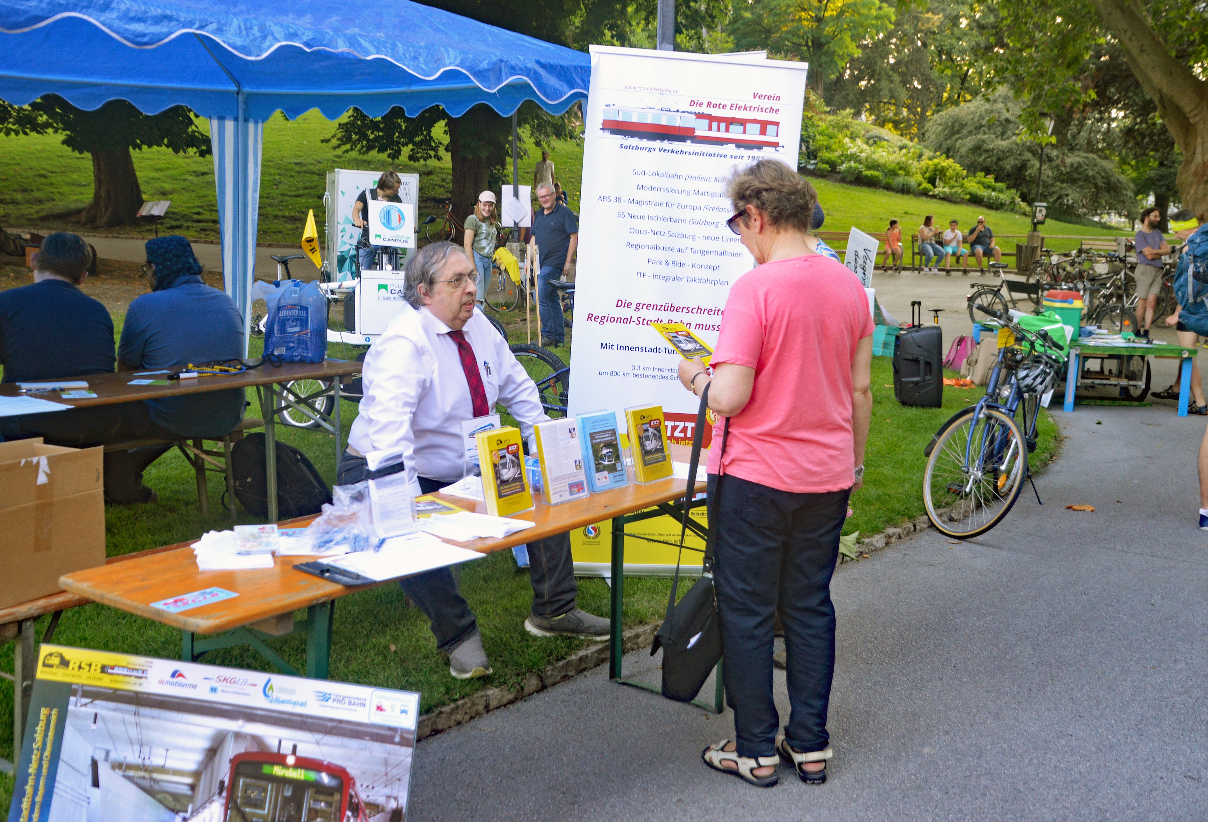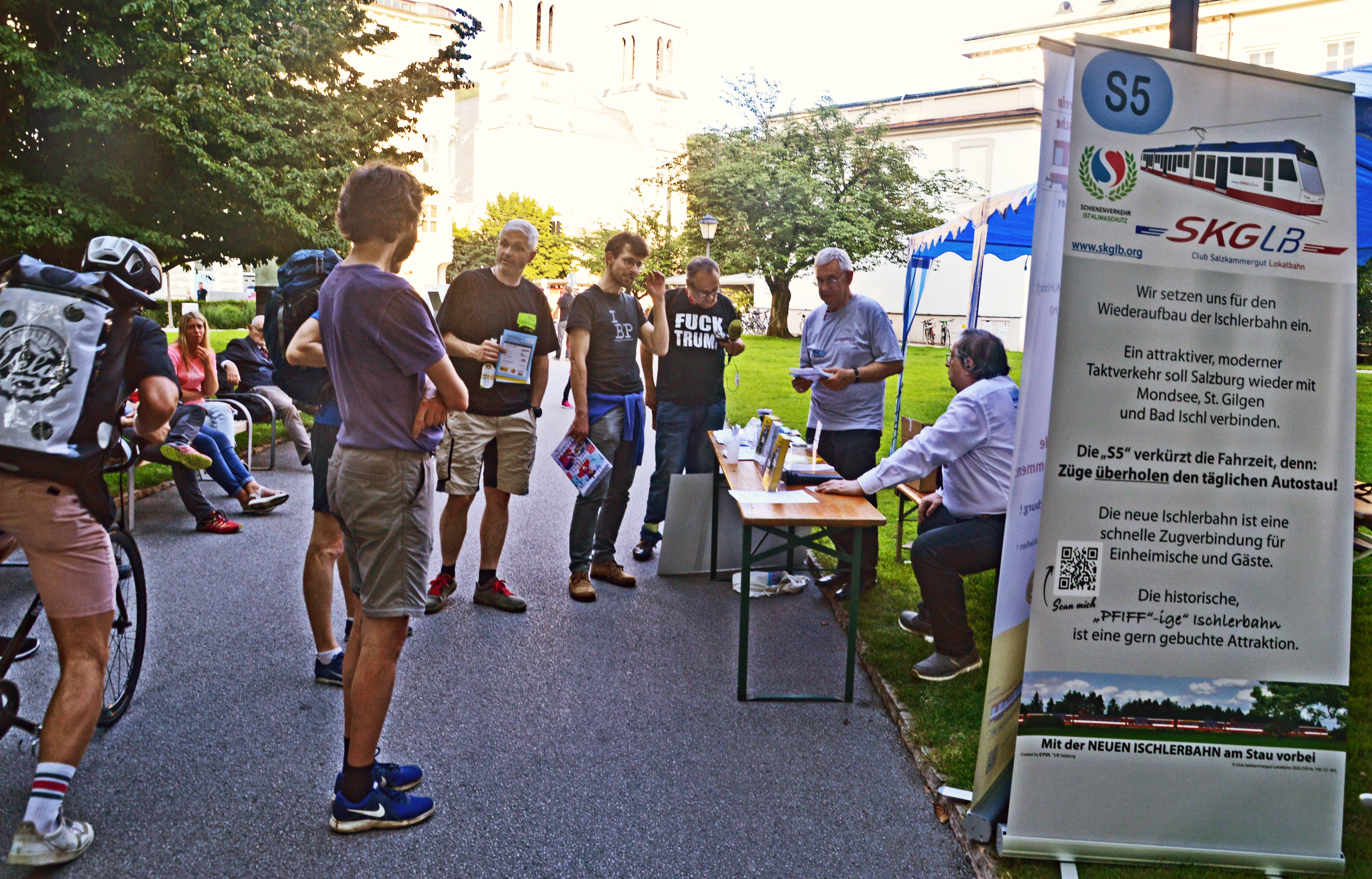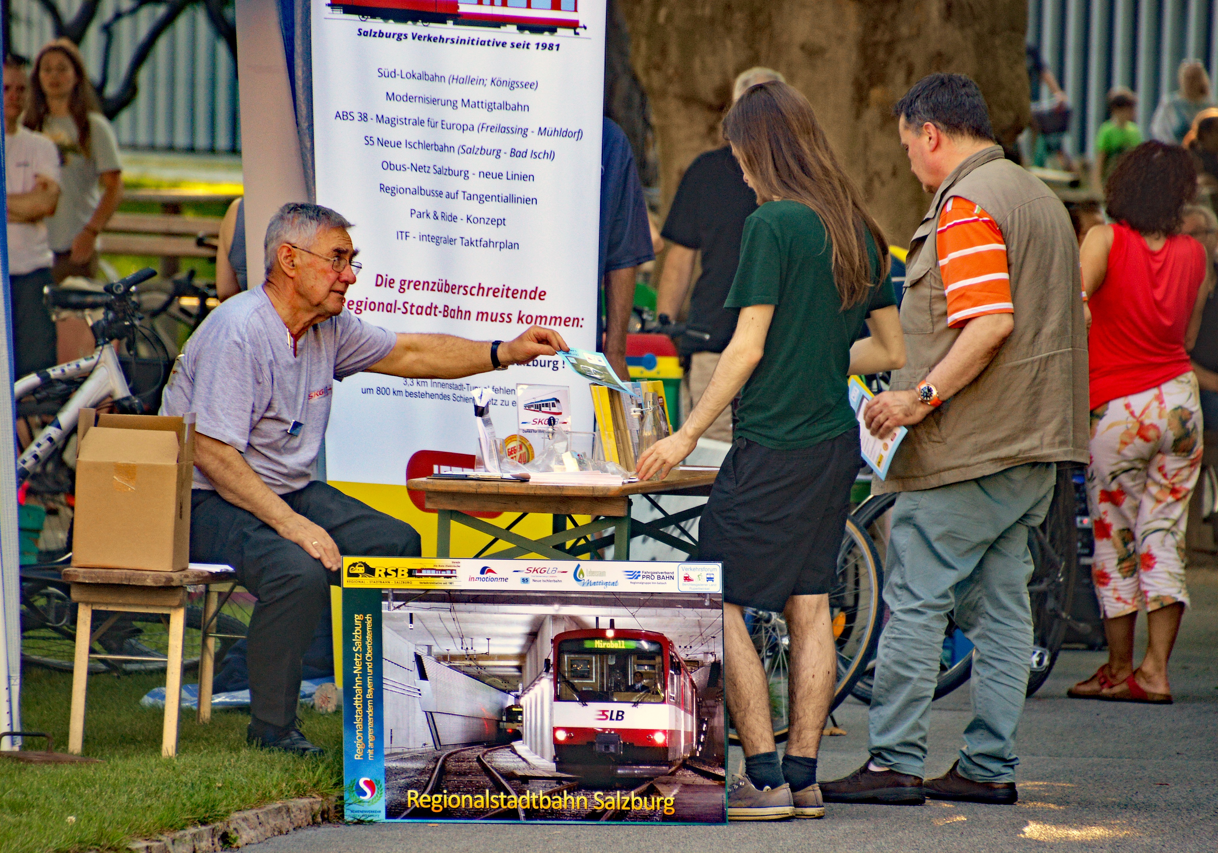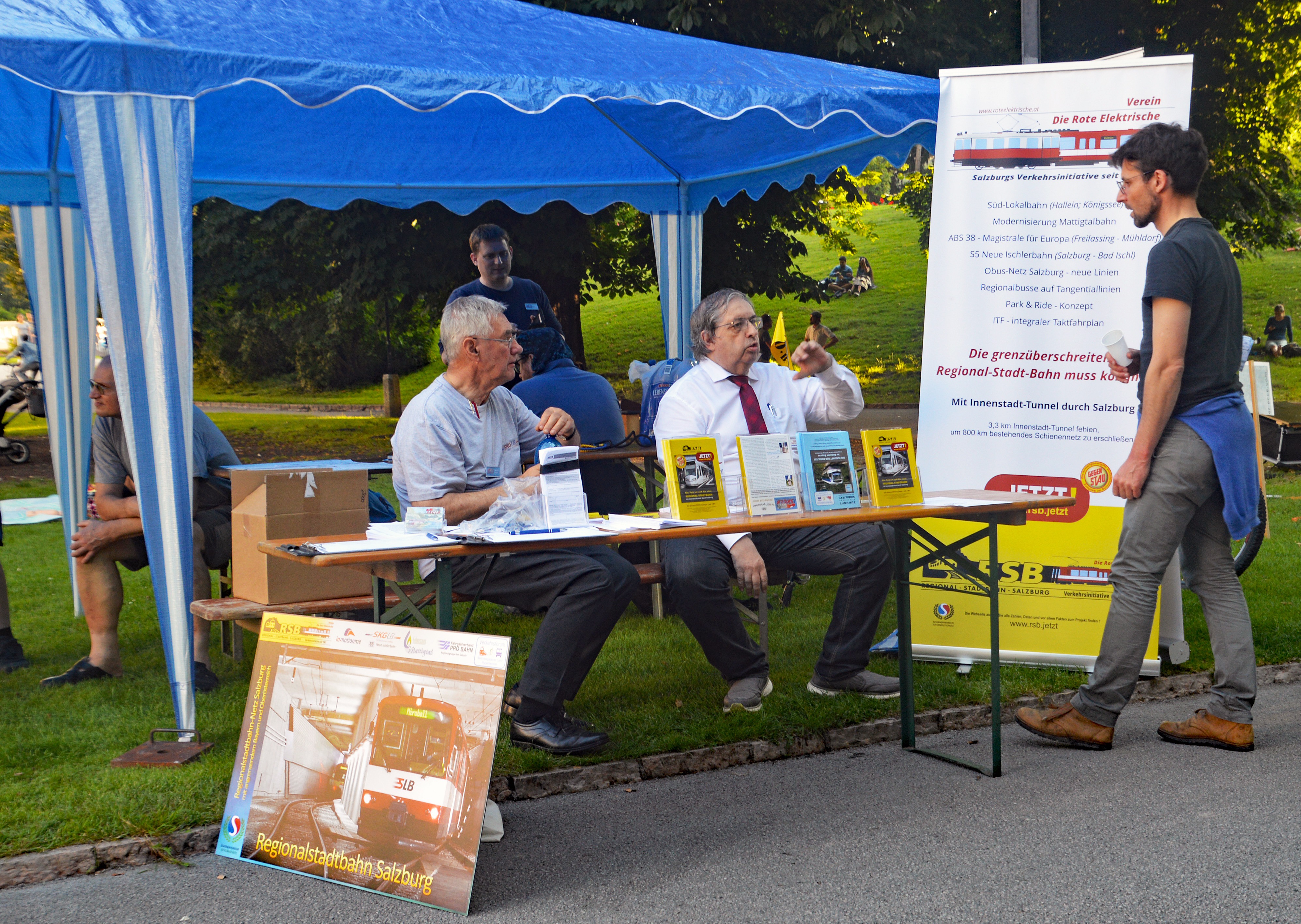 Das windstille und warme Sommerwetter ermöglichte ein gelungenes Initiativenfest mit Musik bis in den späten Abend. Der Organisator Rio Mäuerle zeigte sich sichtlich zufrieden, ebenso, wie der Bürgerlisten-Gemeinderat Lukas Uitz. Das Zelt der ÖPNV-Initiativen des Vereines „Die Rote Elektrische“ war der beliebte Treff auch der „Radlobby“ (vorm. VeloClub), von Dr. Fidelius Krammel, und vieler Radinitiativlern. Von den Schieneninitiativen ergriffen folgende Herren das Mikrofon: Richard Fuchs vom Verein „Die Rote Elektrische“, Sepp Weiser vom Club SKGLB, Gregor Watzl für In-Motion.Me, sowie als Vertreter des Verkehrsforums Berchtesgadener Land und Rupertiwinkel Martin Schön. „Geschichtsunterricht“ gab es über die alte Ischlerbahn von Vereinsobmann Günther Gritsch vom Club Salzkammergutlokalbahn.