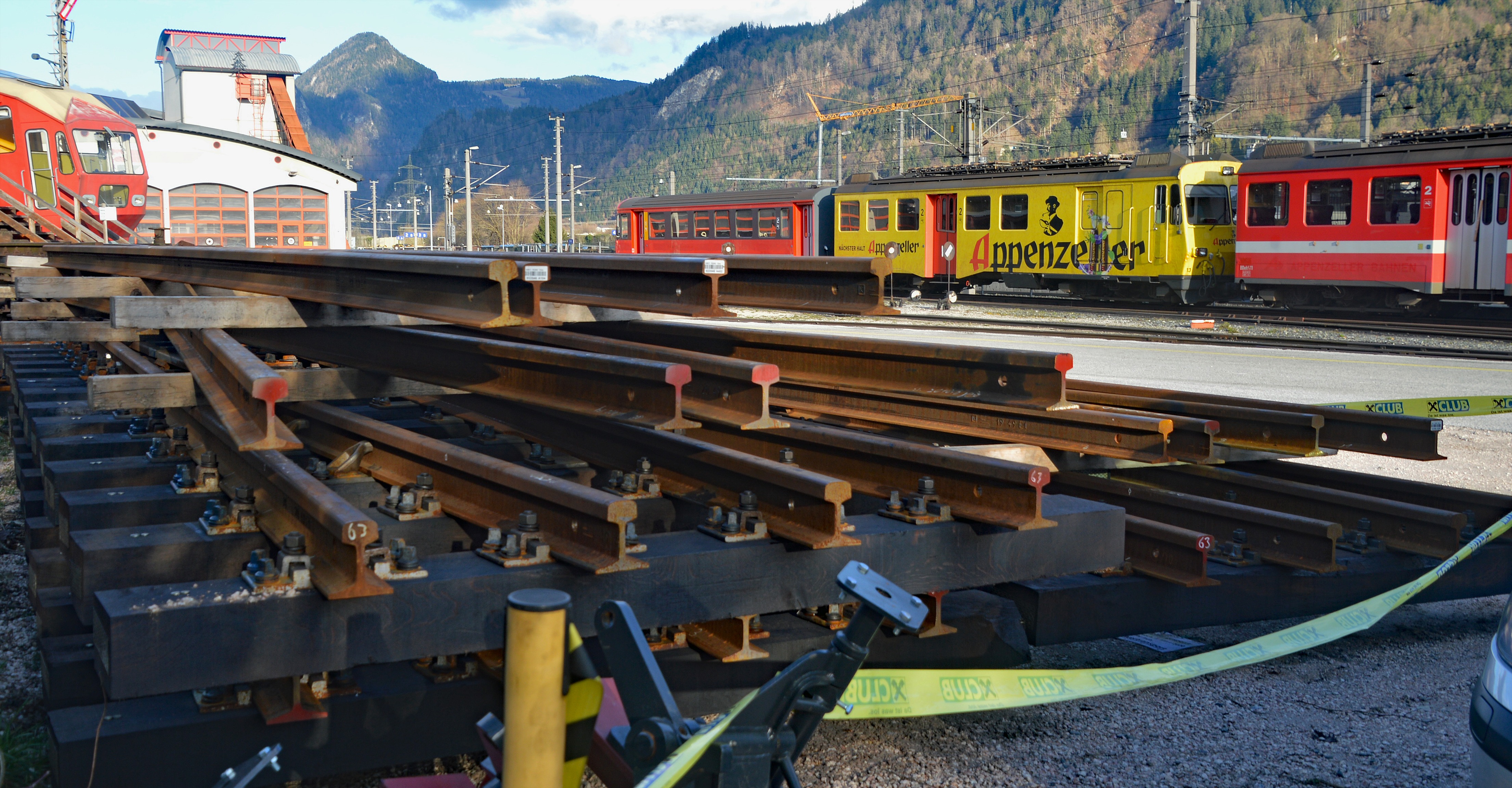 Auf der Achenseebahn wurden am 12. März 2020 fabriksneue Weichen am Bahnhof Jenbach angeliefert und deponiert.