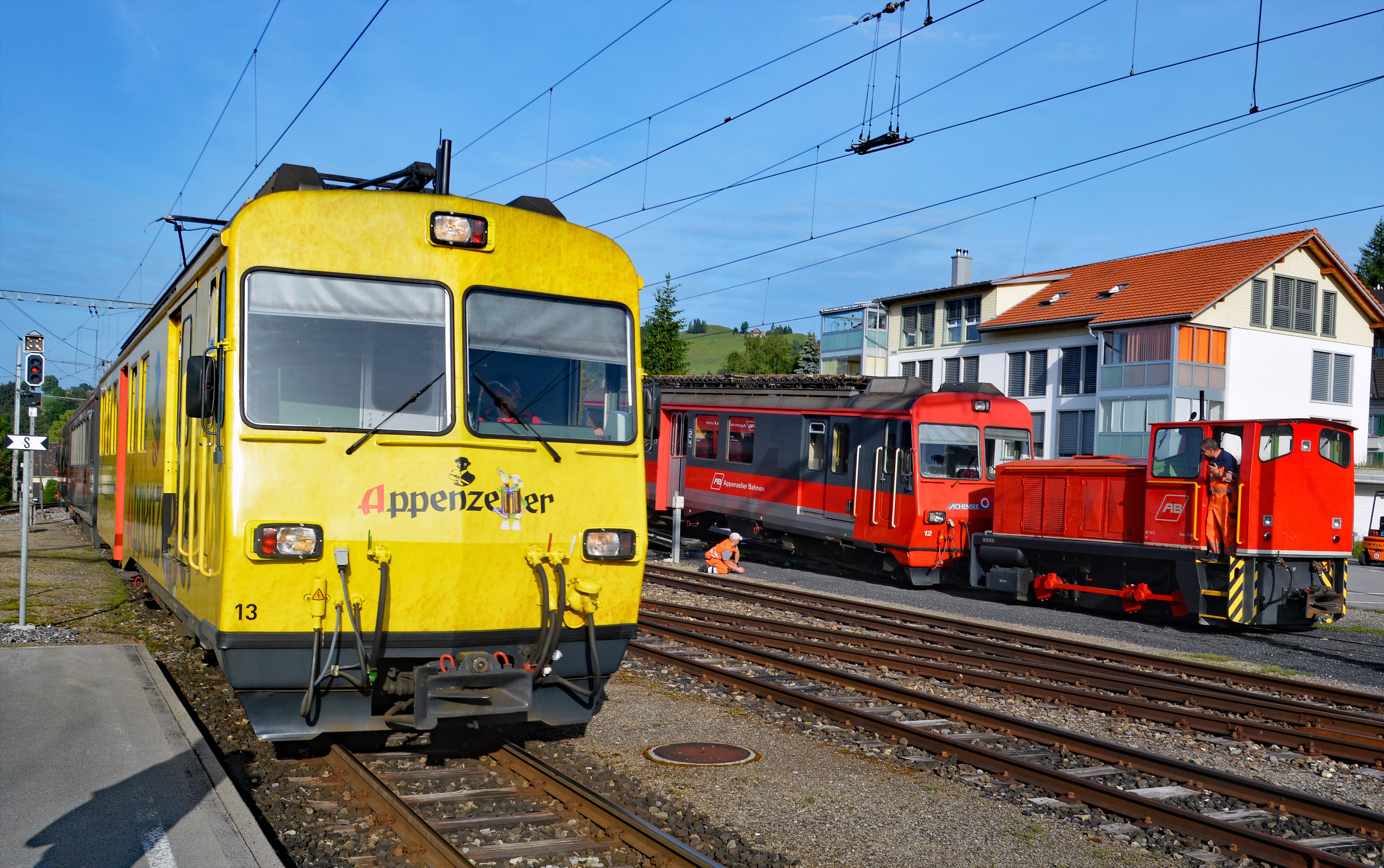 Verladung Appenzellerbahn-Triebwagen für Achenseebahn im Bahnhof Gais im Appenzell. Während das erste Fahrzeug ET12 bereits verladen wird, wird der gelbe ET13 noch im Regelbetrieb auf der Appenzellerbahn benötigt. Die TW fahren bis zuletzt.