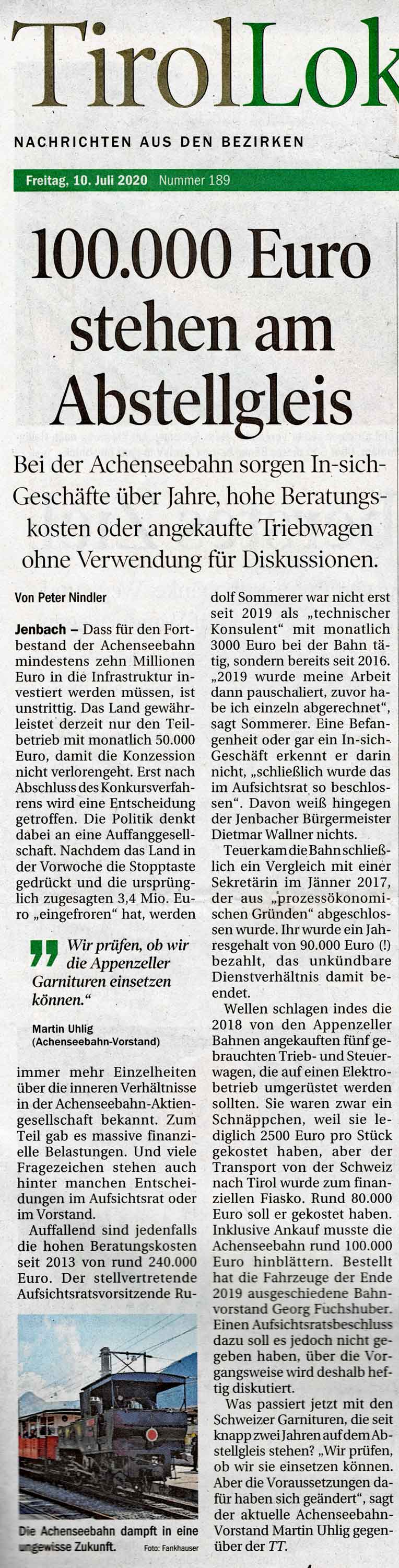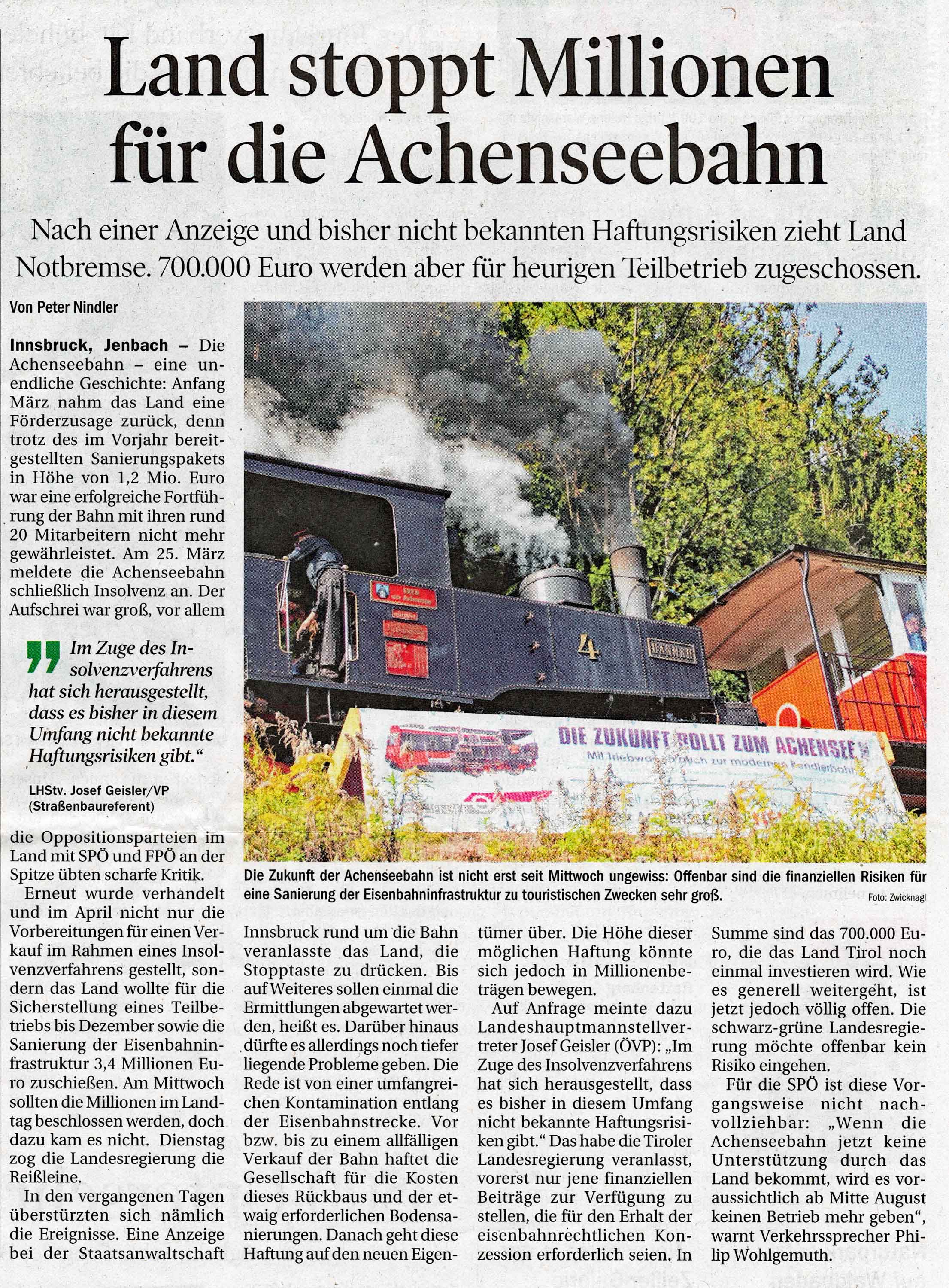 Ich lese immer sehr gerne Ihre Kolumnen in der TT und habe Sie bisher für einen korrekten und nicht parteiorientierten Journalisten gehalten. Ihr Artikel in der heutigen TT über die Achenseebahn ist eindeutig von Herrn Geisler diktiert. Warum wird nie mit fachlich kompetenten Personen gesprochen, hat man Angst, daß zuviel Wahrheit ans Tageslicht kommt.