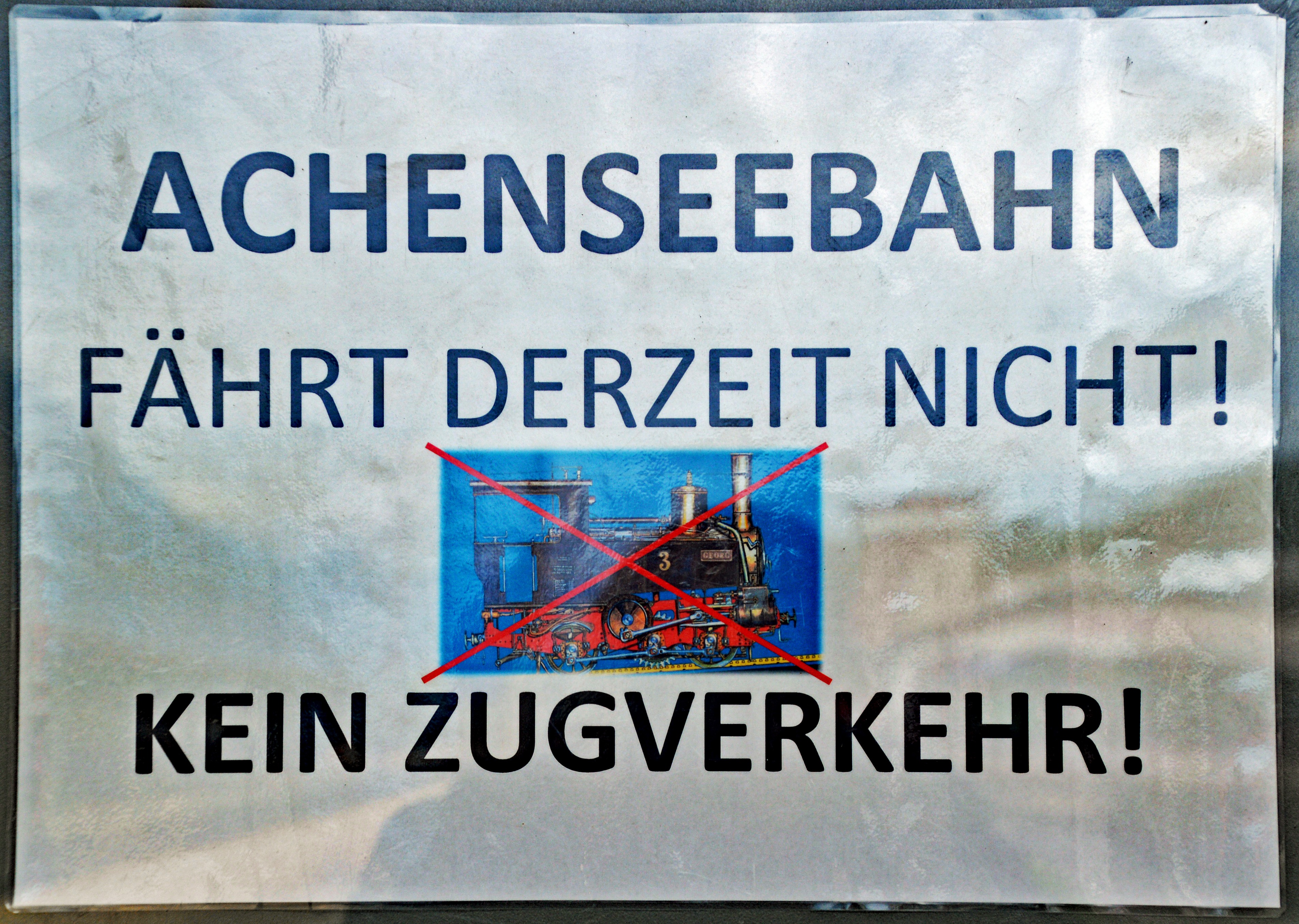 Achenseebahn Bahnhof Jenbach, Hinweisschild am Bahnhofsgebäude Jenbach, dass derzeit die Achenseebahn, wegen des Finanzierungsboykotts des Landes Tirol den Betrieb einstellen musste!