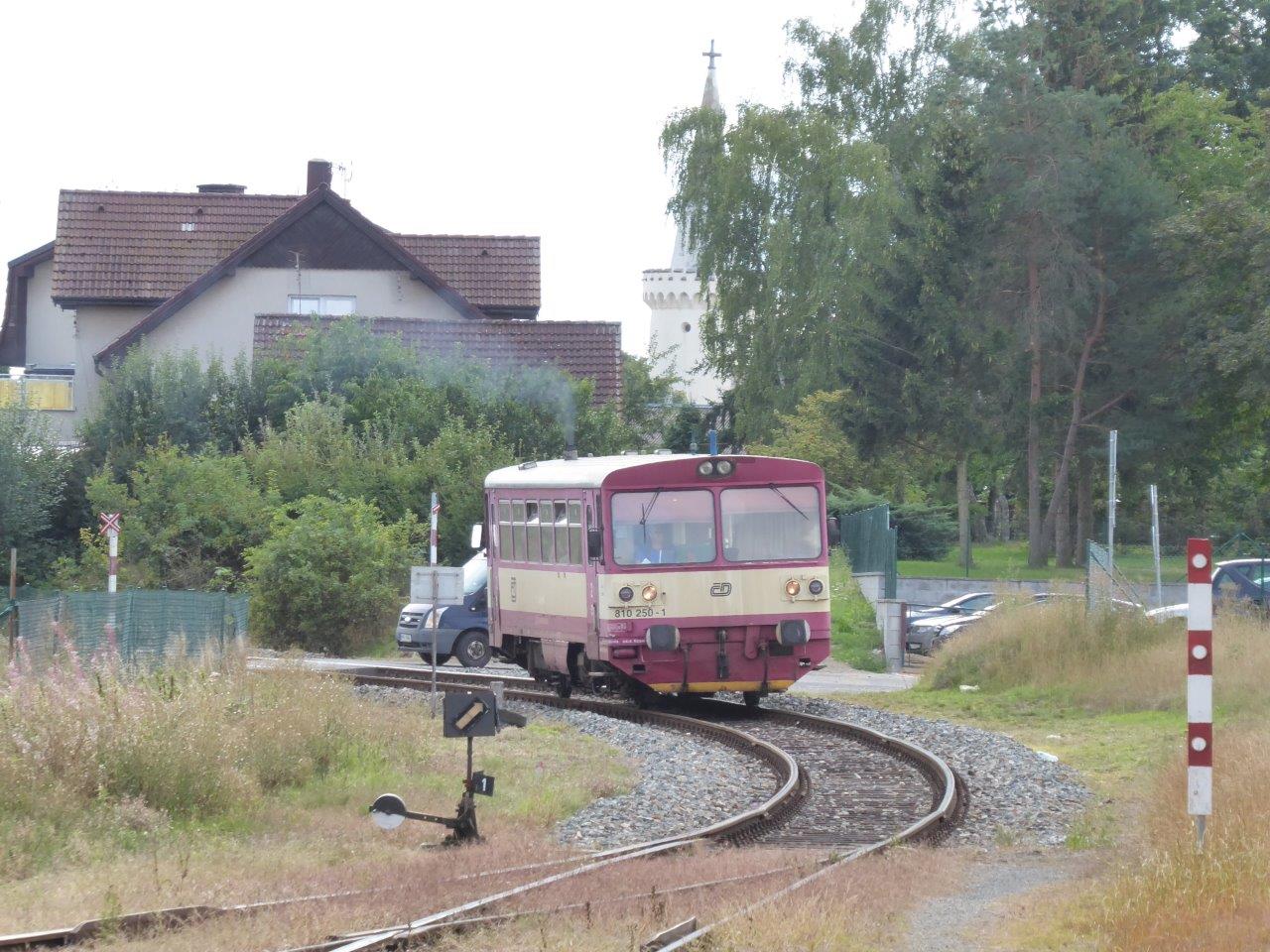 CD-Lokalbahnromantik in Bor/Haid: "Studenka"Schienenbus 810.250 erreicht als Zug 7206 den Bahnhof Bor/Haid