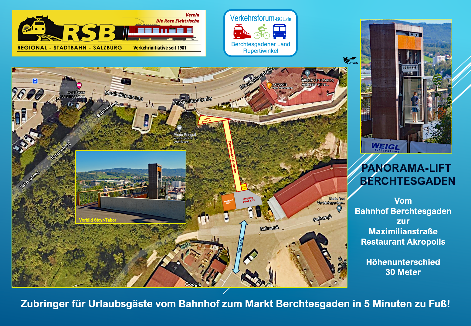 Der Höhenunterschied am Tabor in Steyr ist mit 35 Metern durchaus vergleichbar mit den rund 30 Metern in Berchtesgaden. Dieser Lift geht vom Berchtesgadener Bahnhof, bei der Baywa hinauf zur „Akropolis“, nicht in Athen, sondern zum griechischen Restaurant in Berchtesgaden Maximilianstraße. Auch wenn die Kapazitäten beim Lift, aufgrund der Reisekoffer, Rollatoren und Fahrräder und der schubweisen Nachfrage aufgrund der Ankunft der Züge, für 30-40 Personen, in Berchtesgaden höher als in Steyr sein dürfte, könnte der Panoramalift durchaus relativ bauartgleich mit dem Vorbild in Steyr sein