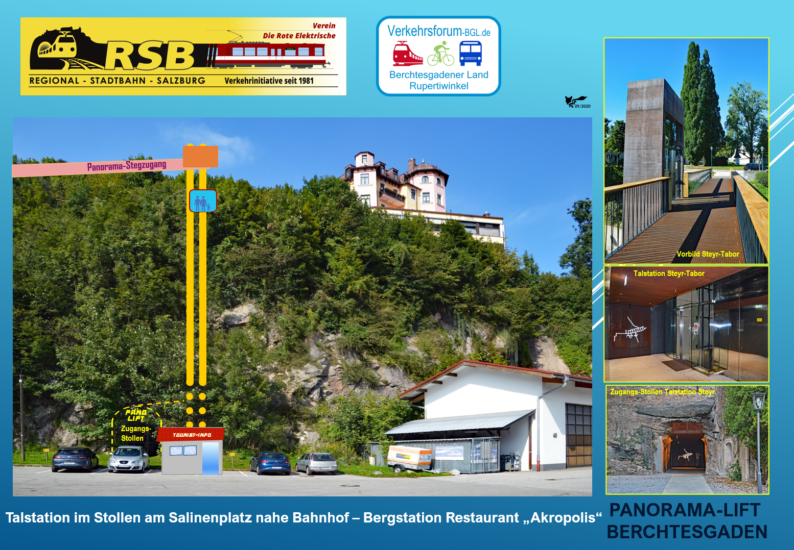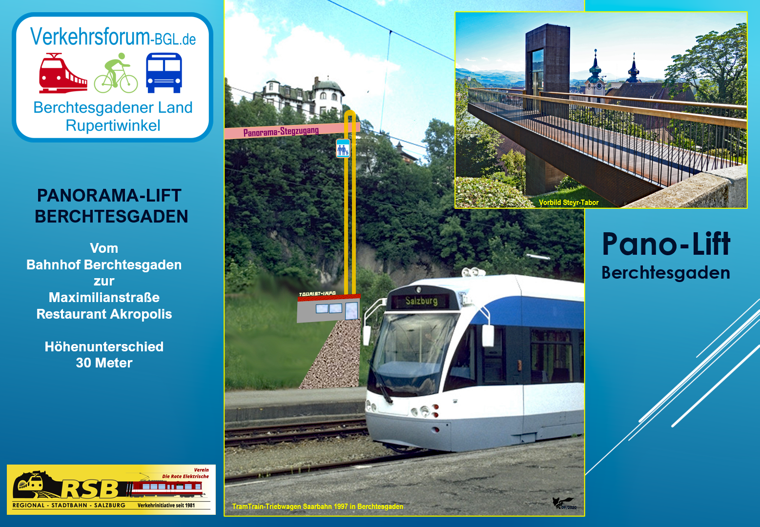 Die Visualisierung des 30 Meter hohen Liftes zwischen dem Bahnhofsgelände und dem Restaurant Akropolis war als Idee bereits 1997, als der TramTrain-Triebwagen von der Saarbahn in Berchtesgaden war, im Raum. Der Tabor-Lift in Steyr zeigt, wie das aussehen kann.