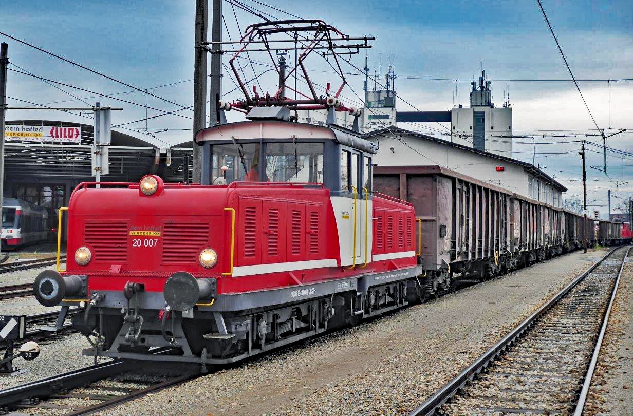 LILO Rübenverkehr: E 20.007 (SGP/ELIN,1956) in Eferding abfahrbereit mit einem Leerwagenzug in Richtung Rübenplatz Emling, am Zugschluss E 22.001(Ganz,1915).