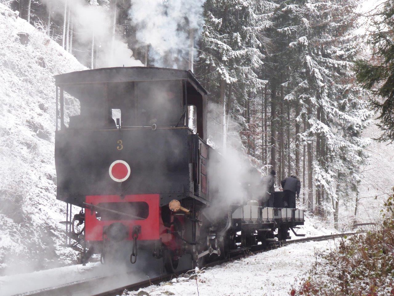 Lok 3 bei der Bergfahrt durch den adventlichen Bergwald mit einem Dienstgüterzug zwischen Fischl und Eben
