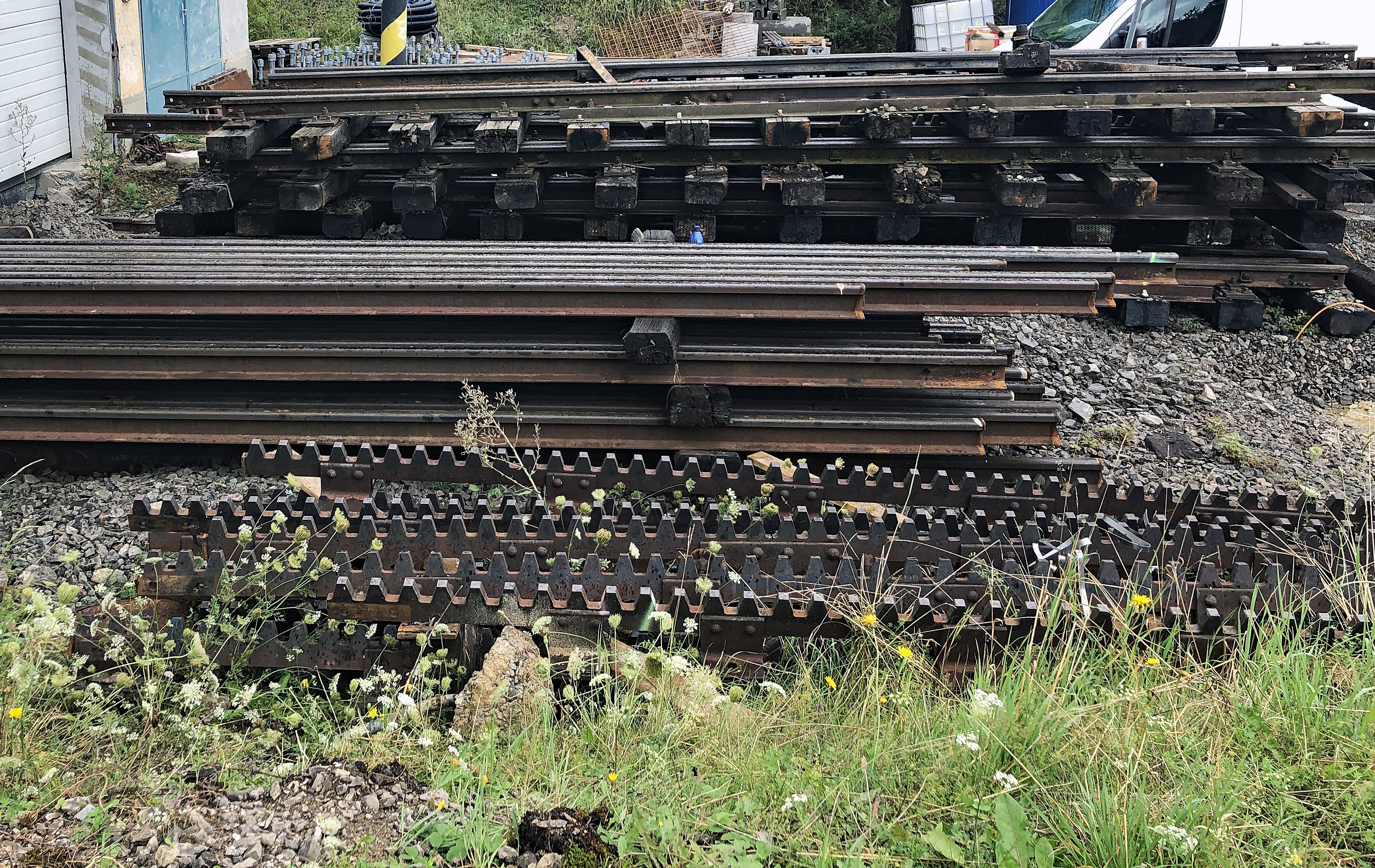 Zahnradbahn Štrba-Štrbské Pleso: Die Zahnstangenweichen und die Fahrleitungsmasten hätten auf der Achenseebahn v.a. für Ausweichen weiter verwendet werden können, wenn die Politik in Tirol die Bahn nicht in den Konkurs getrieben hätte.