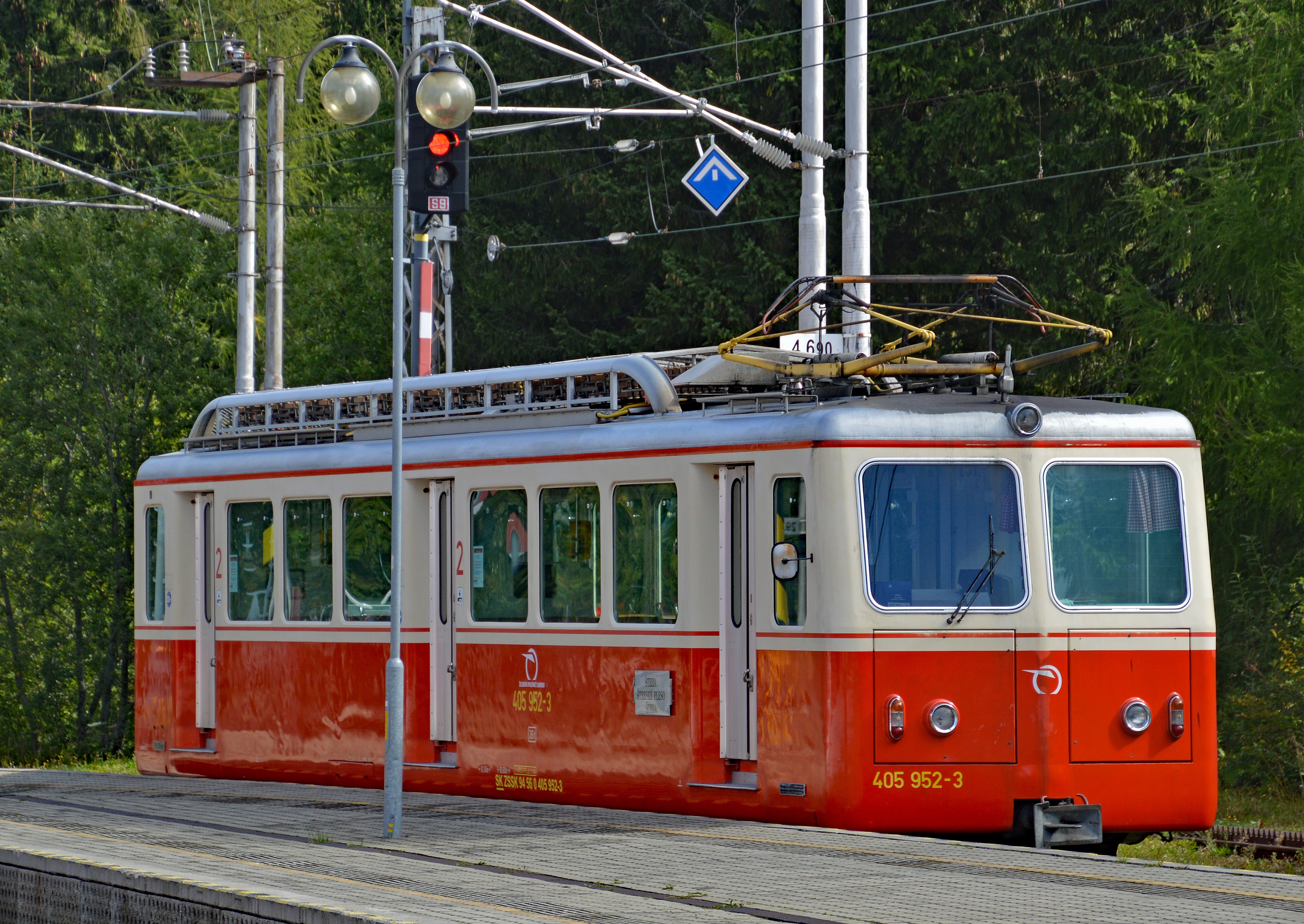 Zahnradbahn Štrba-Štrbské Pleso oder Tschirmer-Bahn in der Hohen Tatra System Von Roll eröffnet zur Nordischen Schi-WM 1970. Zug mit Triebwagen 405.951 mit Steuerwagen 905.951 abfahrbereit zum Tschirmer-See oder Štrbské Pleso.