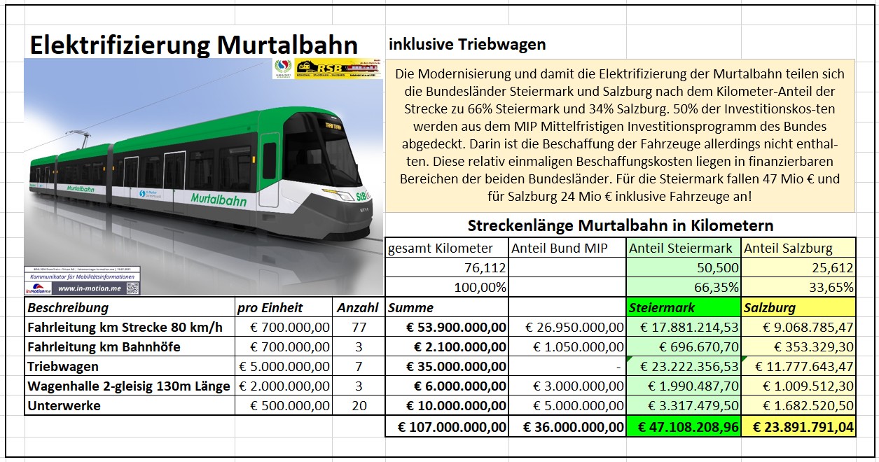 Die Modernisierung und damit die Elektrifizierung der Murtalbahn teilen sich die Bundesländer Steiermark und Salzburg nach dem Kilometer-Anteil der Strecke zu 66% Steiermark und 34% Salzburg. 50% der Investitionskosten werden aus dem MIP Mittelfristigen Investitionsprogramm des Bundes abgedeckt. Darin ist die Beschaffung der Fahrzeuge allerdings nicht enthalten. Diese relativ einmaligen Beschaffungskosten liegen in finanzierbaren Bereichen der beiden Bundesländer. Für die Steiermark fallen 47 Mio € und für Salzburg 24 Mio € inklusive Fahrzeuge an!