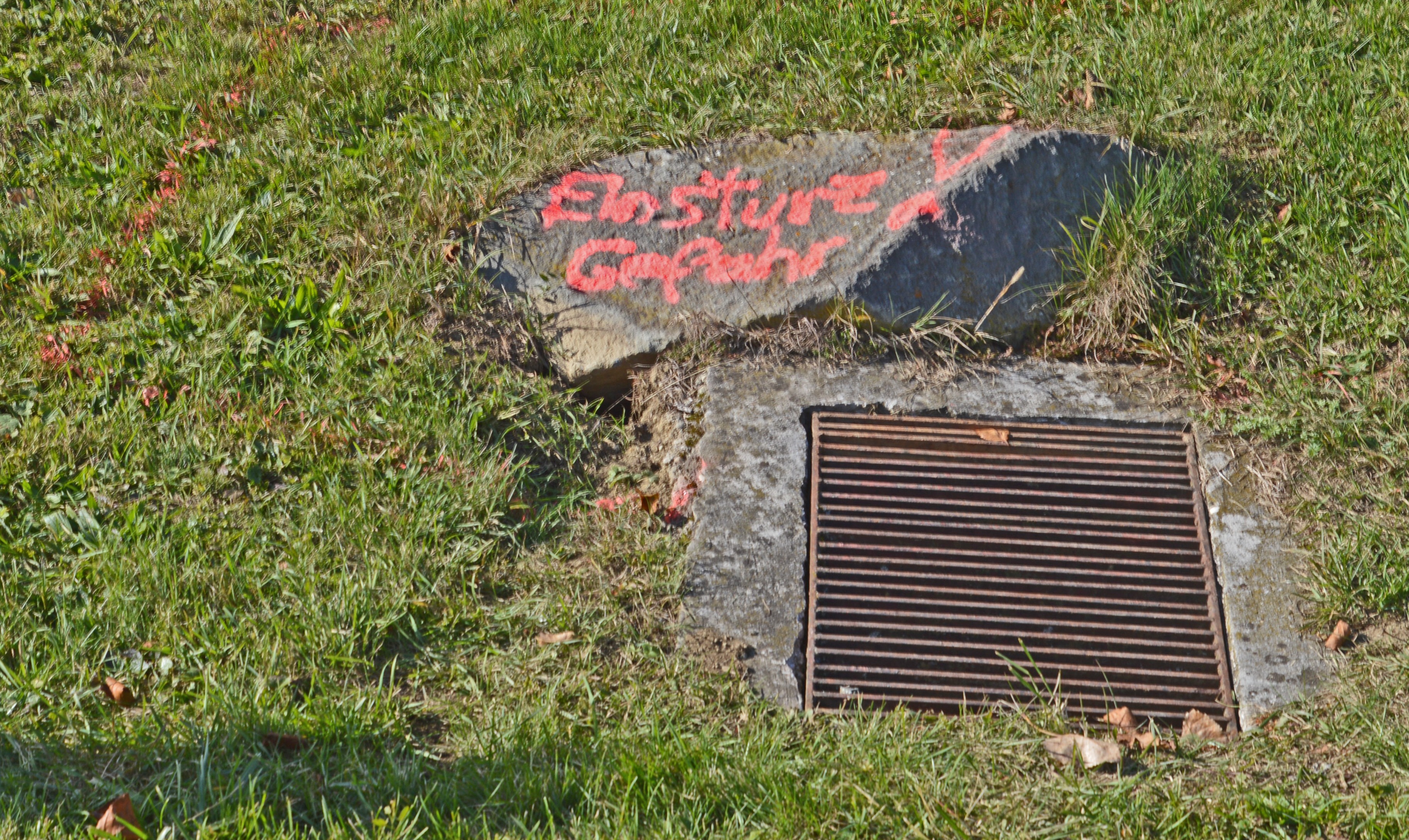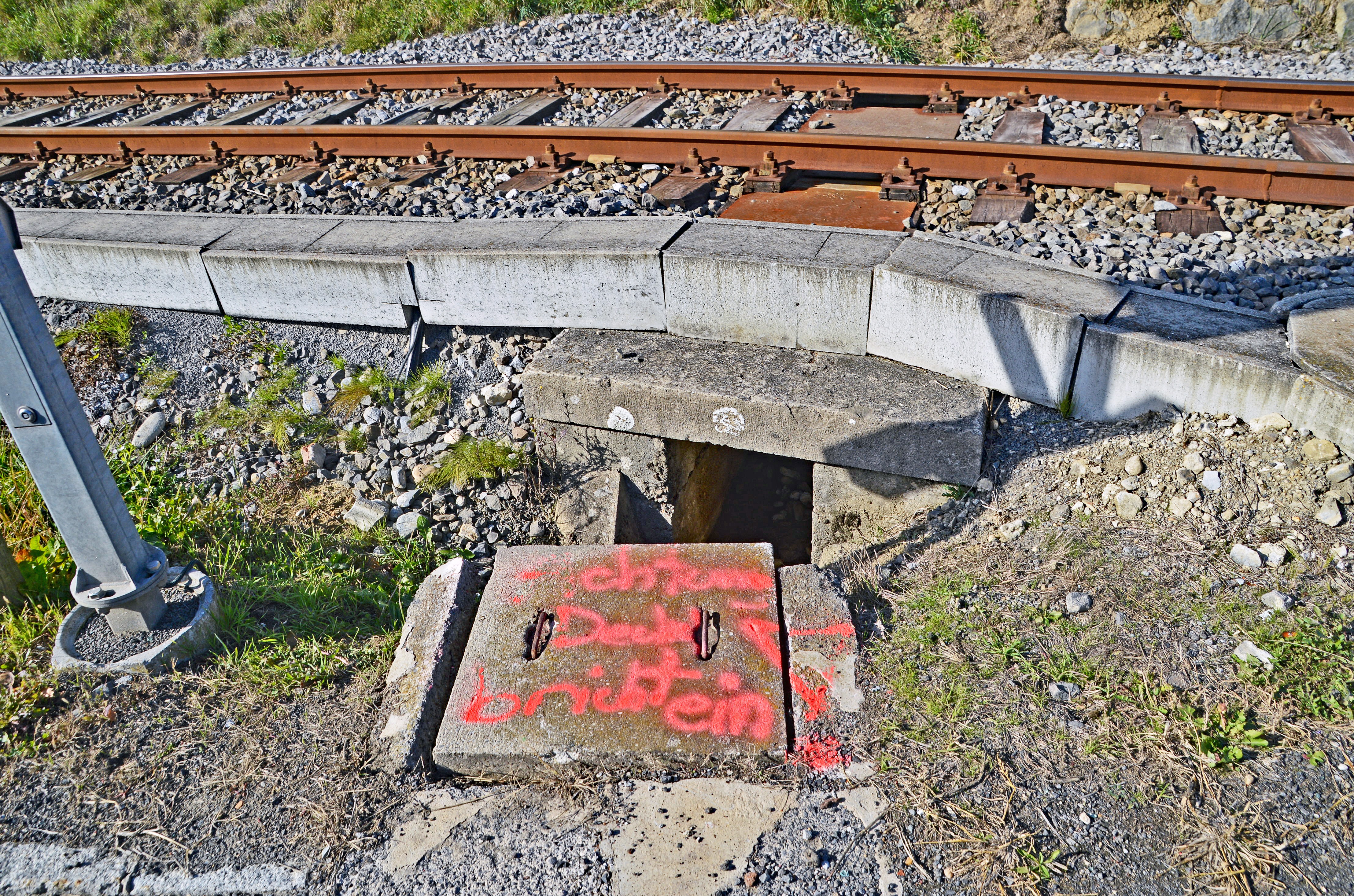 Oberhalb der Bahnstrecke der Gleichenberger Bahn im Raum Oedt ist ein wasserdurchsättigter Hang, der bei Hochwasser den Bahndamm und die umliegenden Häuser regelmäßig umspült. Das Wegener-Net Graz hat hier Klima-Mess-Stationen eingerichtet, die Wetterdaten alle paar Minuten aufzeichnen. Man weiß von dem Problem der Hangrutschungen und trotzdem gibt es kaum eine Verbindung zwischen den Drainagerohren im Hang mit den Bachdurchlässen am Bahndamm. Hochwässer sind regelmäßig vorprogrammiert. Man beachte die Beschriftungen, wie "Achtung Deckel bricht ein!" Wer bitte macht hier etwas?