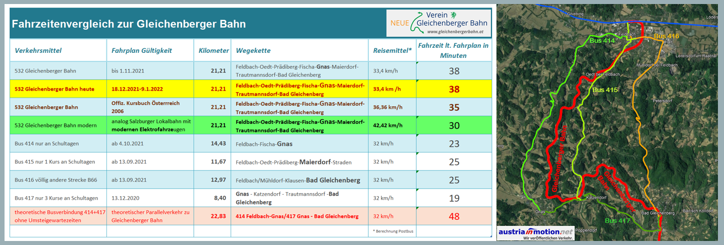 Fahrzeitvergleich Gleichenberger Bahn mit den umliegenden Buslinien 414, 415, 416, 417