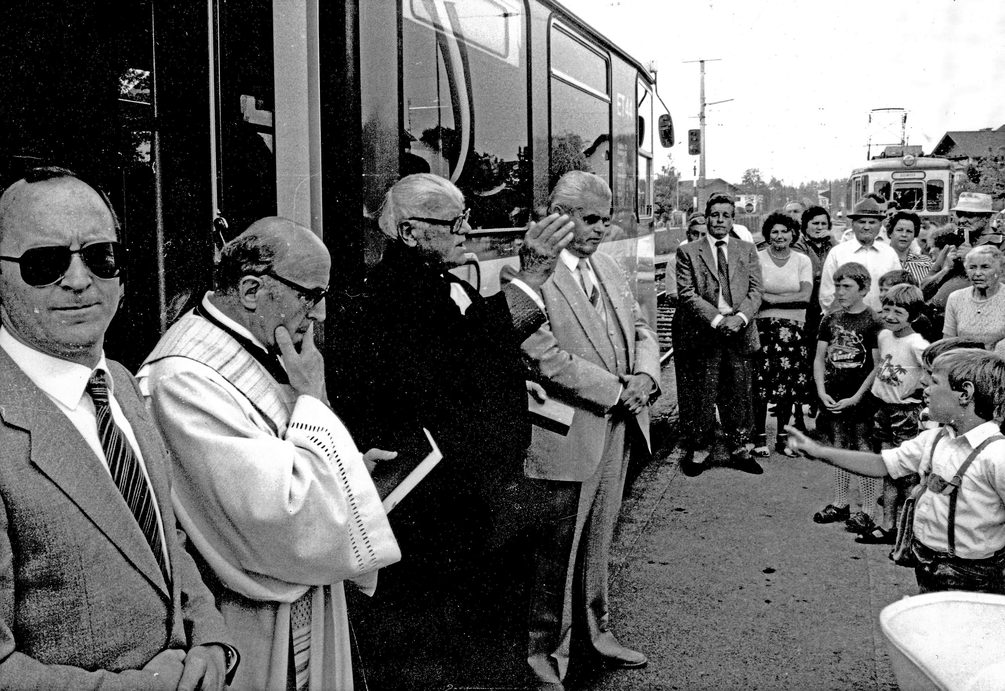 Eröffnung Haltestelle "Oichtensiedlung" Salzburger Lokalbahn 24.12.1982 v.l.: Bürgermeister Oberndorf Dr. Raimund Traintinger, Lokalbahn-Direktor Dr. Josef Riedl, Betriebsleiter Gunter Mackinger Fahrzeugsegnung ET 45 "Lamprechtshausen" im Bahnhof Lamprechtshausen Fahrzeugsegnung ET 44 Bürmoos im Bahnhof Bürmoos. ganz links Dir. Dr. Josef Riedl