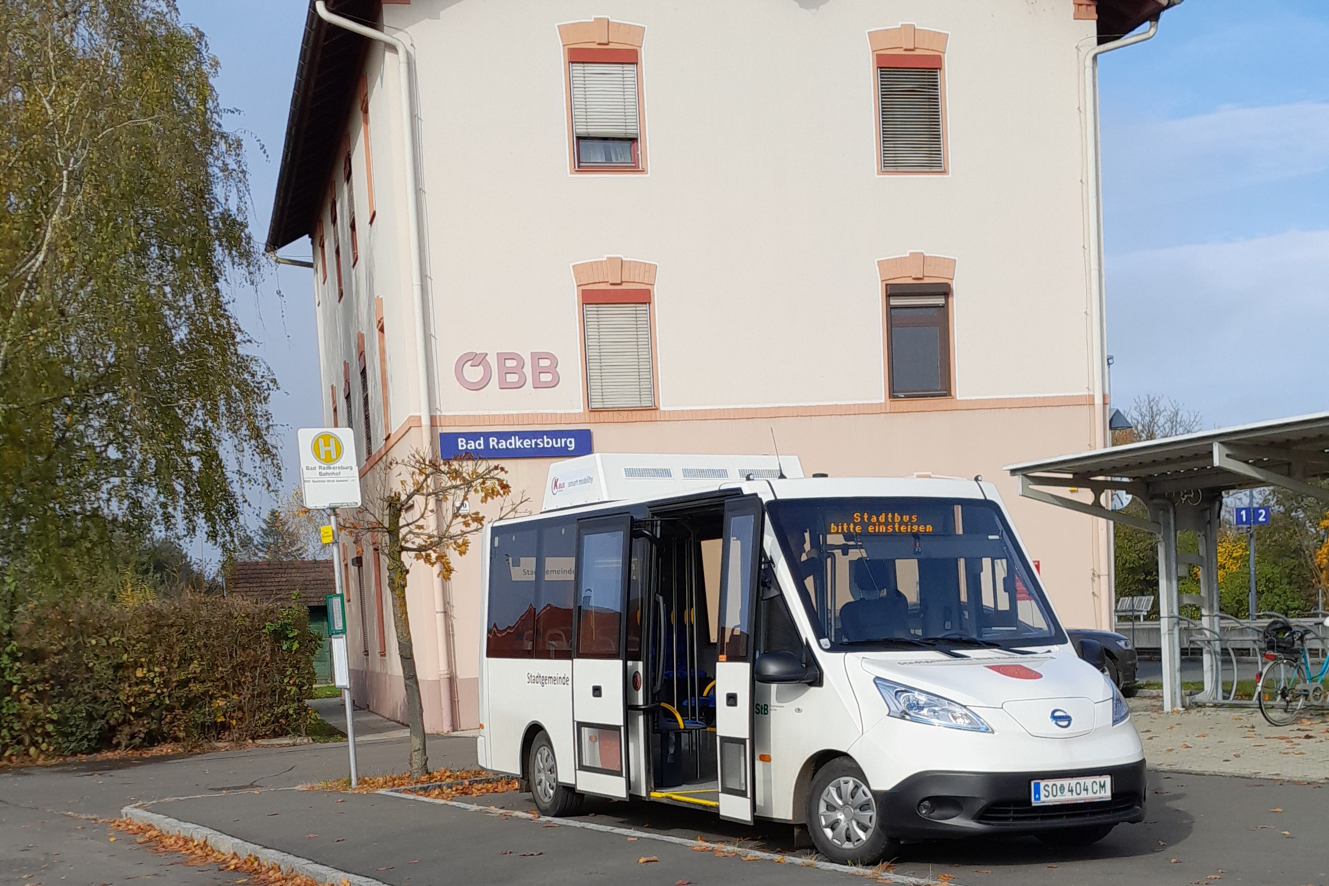 Elektro-Bus der Gemeinde Bad Radkersburg am Bahnhof Bad Radkersburg. Die Salzburger Lokalbahn als "Western Express" Titelbild. Hexenturm Maßstab 1:5 und die Offiziersbaracke des Kriegsgefangenenlagers Feldbach-Mühldorf mit Stele für Anruf-Taxi