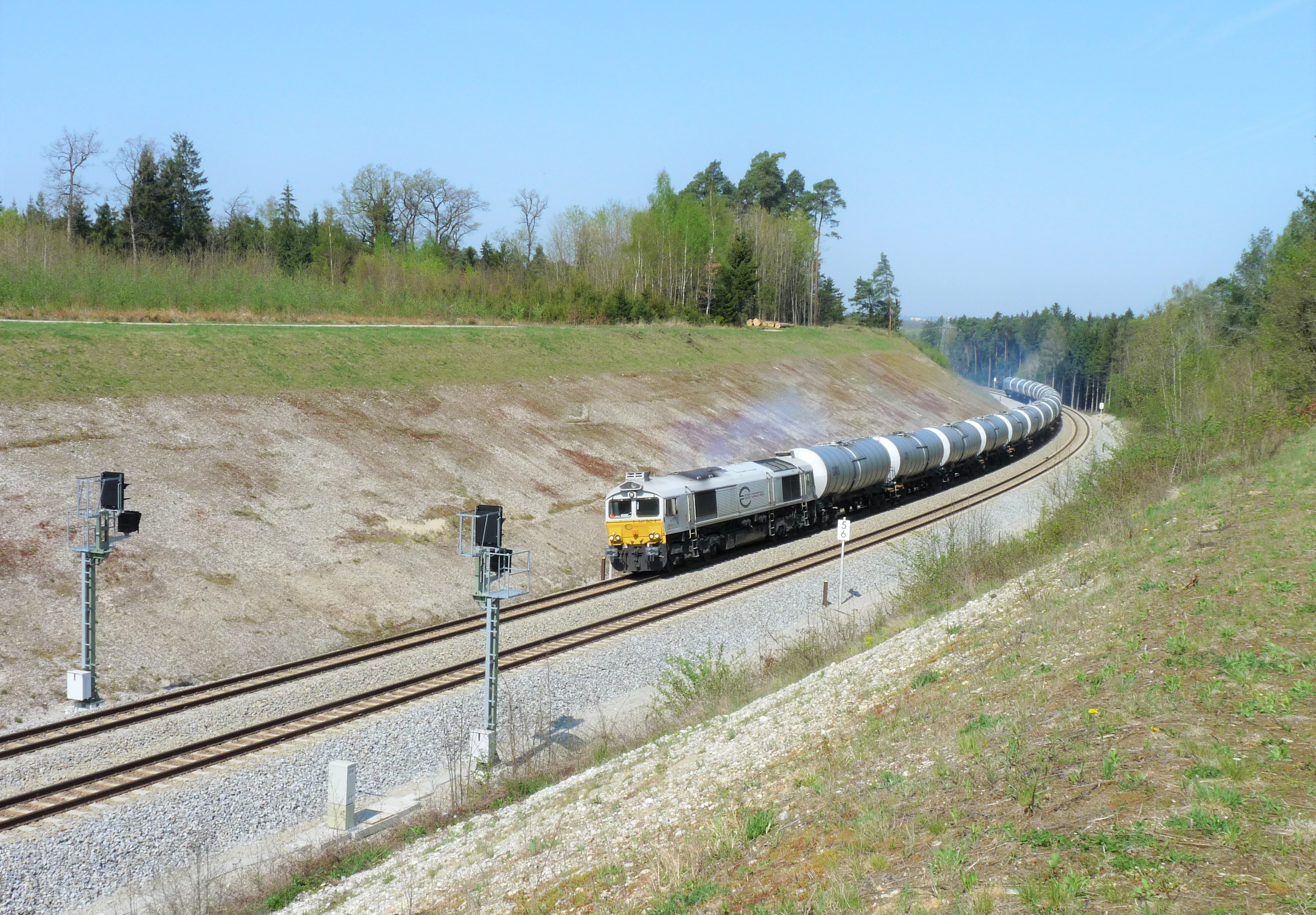 Zweigleisig ausgebaut wurde im Zug der ABS38 bisher nur der Abschnitt Ampfing - Mühldorf - Tüßling, hier ein Kesselwagenganzzug bei den Einfahrsignalen des Bahnhofs Tüßling