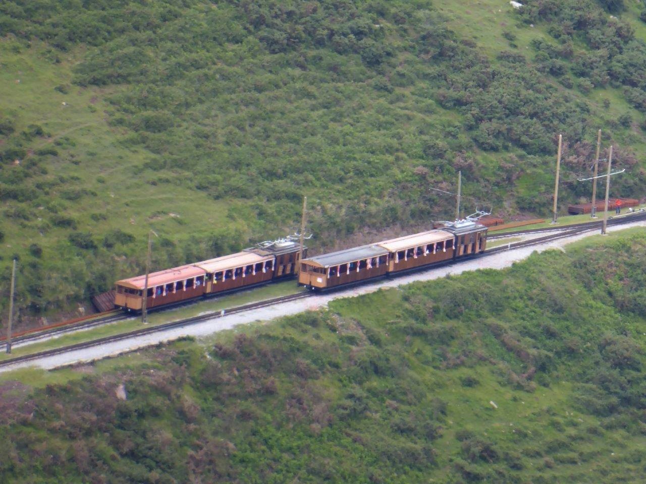Lok 3 (SLM/1914) in Les Trois Fontaines. Lok 5 (SLM/1912) im Steilanstieg zwische Les Trois Fontaines und der Bergstation. Kreuzungsstation in Streckenmitte.