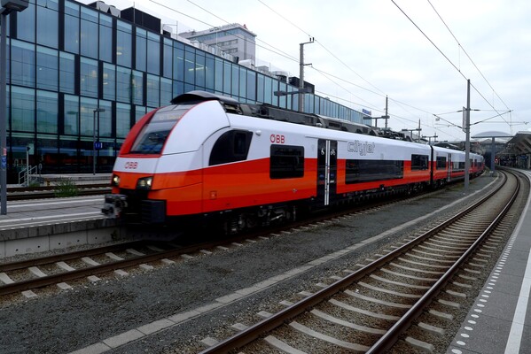Schienen-Personenverkehr am Salzburger Hauptbahnhof. Erstmals zu Gast der neu aufbereitete Talent 1 Triebwagen der ÖBB im "Salzburg Verkehr" Design.