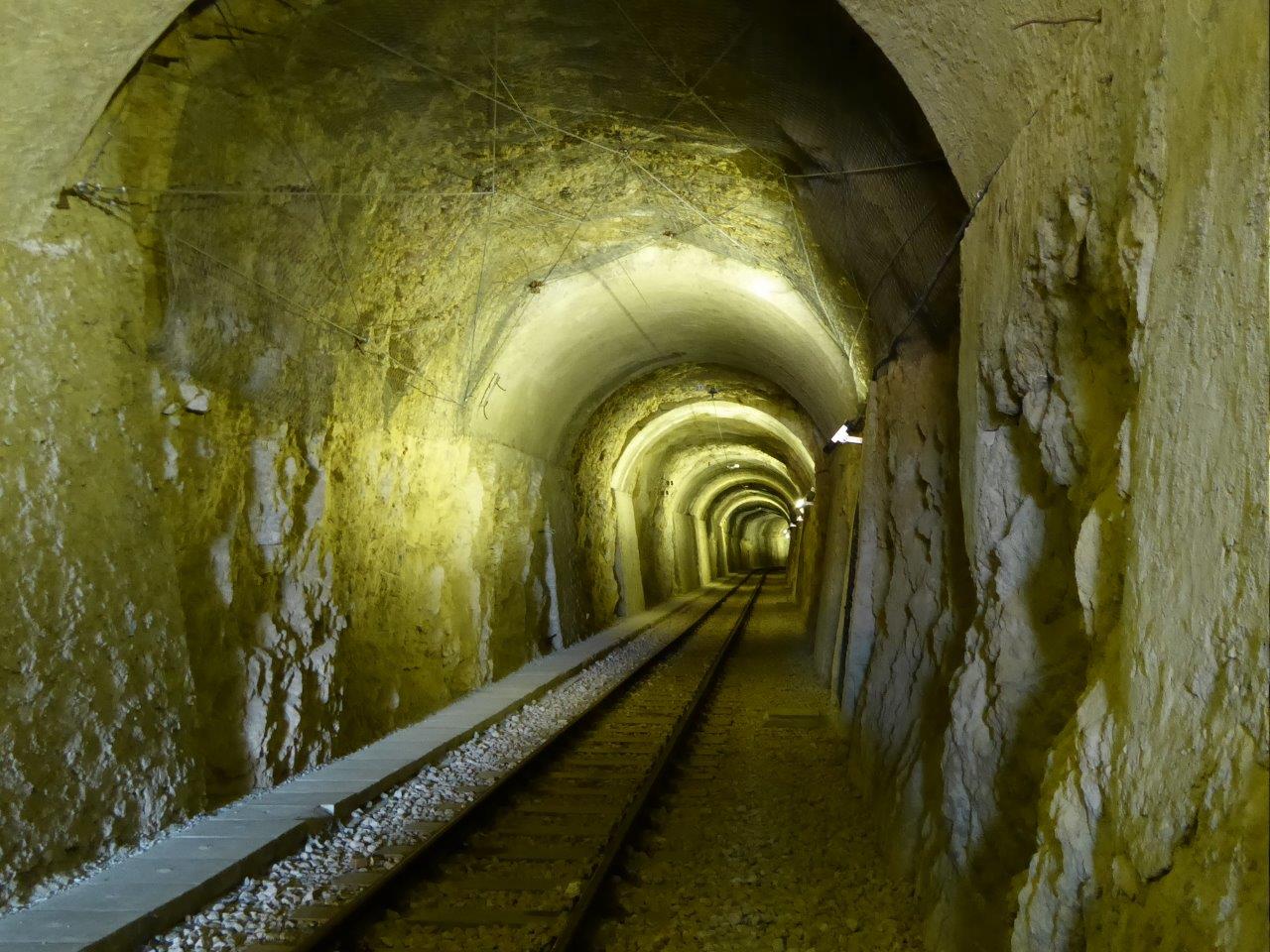 Blick in den reaktivierten Montale Tunnel. Das stadtseitige Tunnelportal des Montale Tunnel in San Marino Citta. Der perfekt restaurierte Triebwagen AB 03 (Carminati& Toselli/TIBB, 1931) im Montale Tunnel.