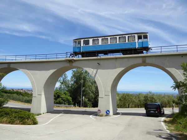 Der restaurierte Beiwagen AB 51 steht auf dem Viadukt bei Fontevecchie. Stolz prangt wieder das Staatswappen von San Marino am AB 03. Ein schwacher Ersatz für die Lokalbahn ist die 1959 errichtete und 1996 modernisierte Seilbahn von Borgo Maggiore zur Altstadt von San Marino mit einem Höhenunterschied von 166 m.