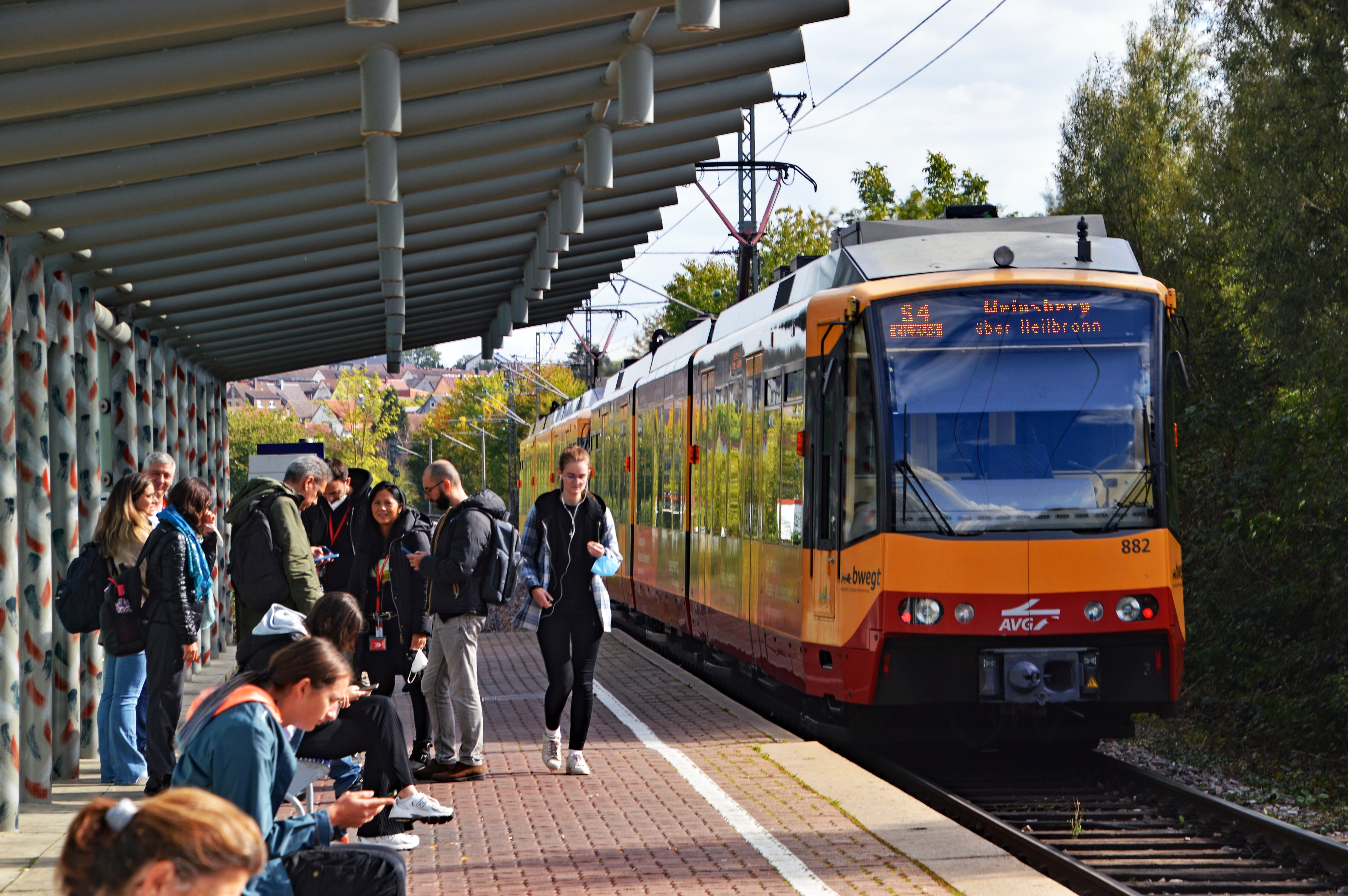 Dort zweigt die Strecke nach Menzingen ab, während wir bis Odenheim weiterfahren. Zurück geht es auf derselben Strecke über Bruchsal wieder nach Karlsruhe Hauptbahnhof. Dort wollen wir rechtzeitig eintreffen, damit die Kollegen, die nach Salzburg zurückfahren möchten, dort den Zug nach Stuttgart und München erreichen können.