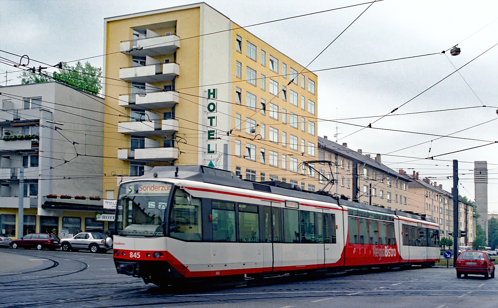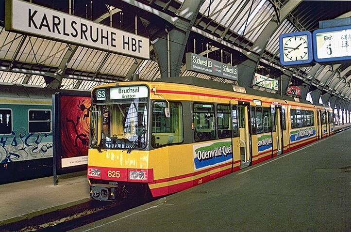 Zweisystemtriebwagen 825 abfahrtbereit Richtung Bruchsal in Karlsruhe Hbf. Dieses Foto war das Farbtitelbild der allerersten farbigen Ausgabe der vereinseigenen Zeitschrift "Regionale Schienen" 1996