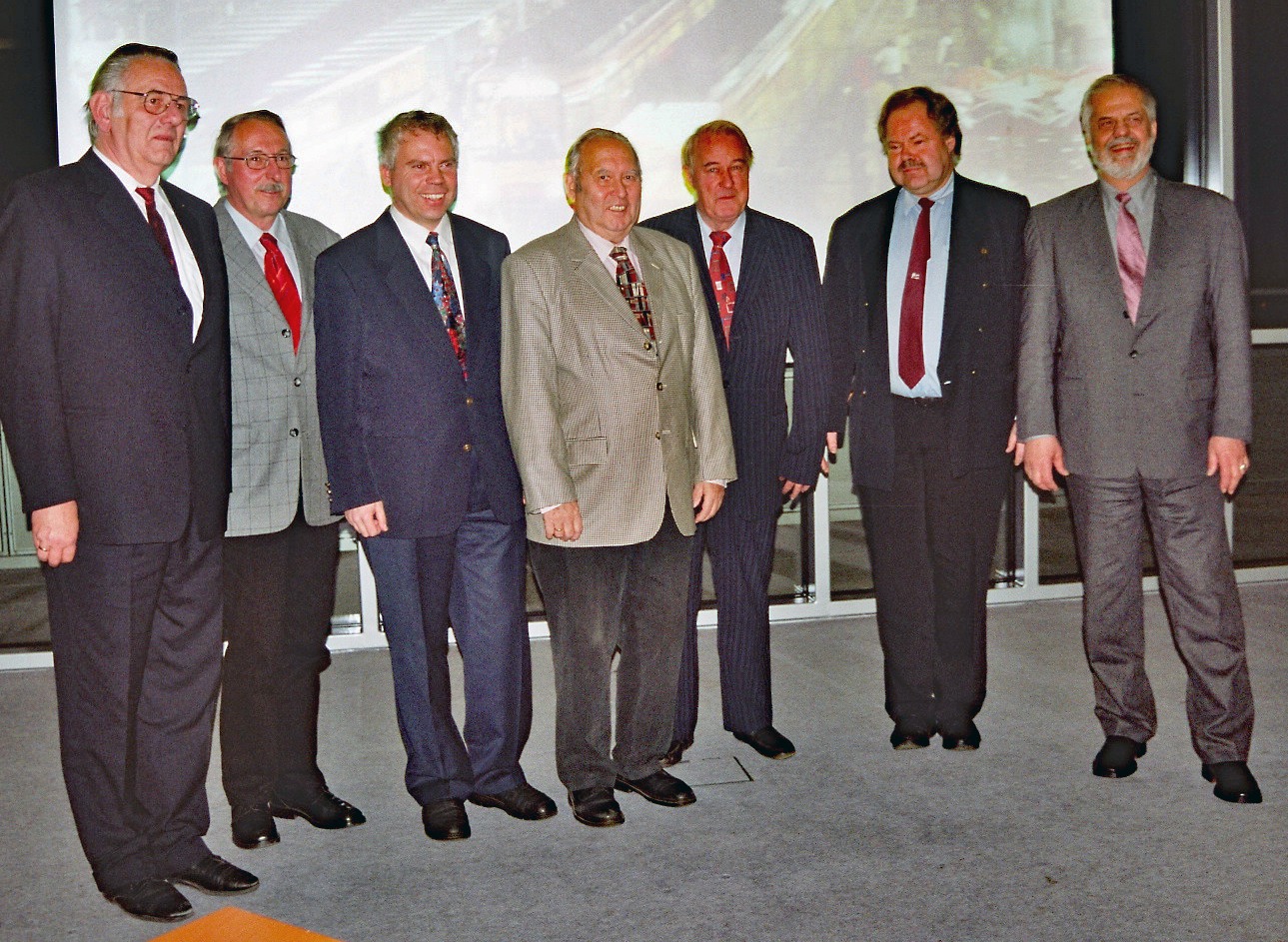 v.l.: Rudolf Barth Organisator Horber Schienentage, leicht verdeckt Alois Perner+, Ing. Horst Speer+, Otto Schallaböck BIM Graz, Erste Bürgermeisterin Margret Mergen, Dir. DI Dr. Dieter Ludwig.