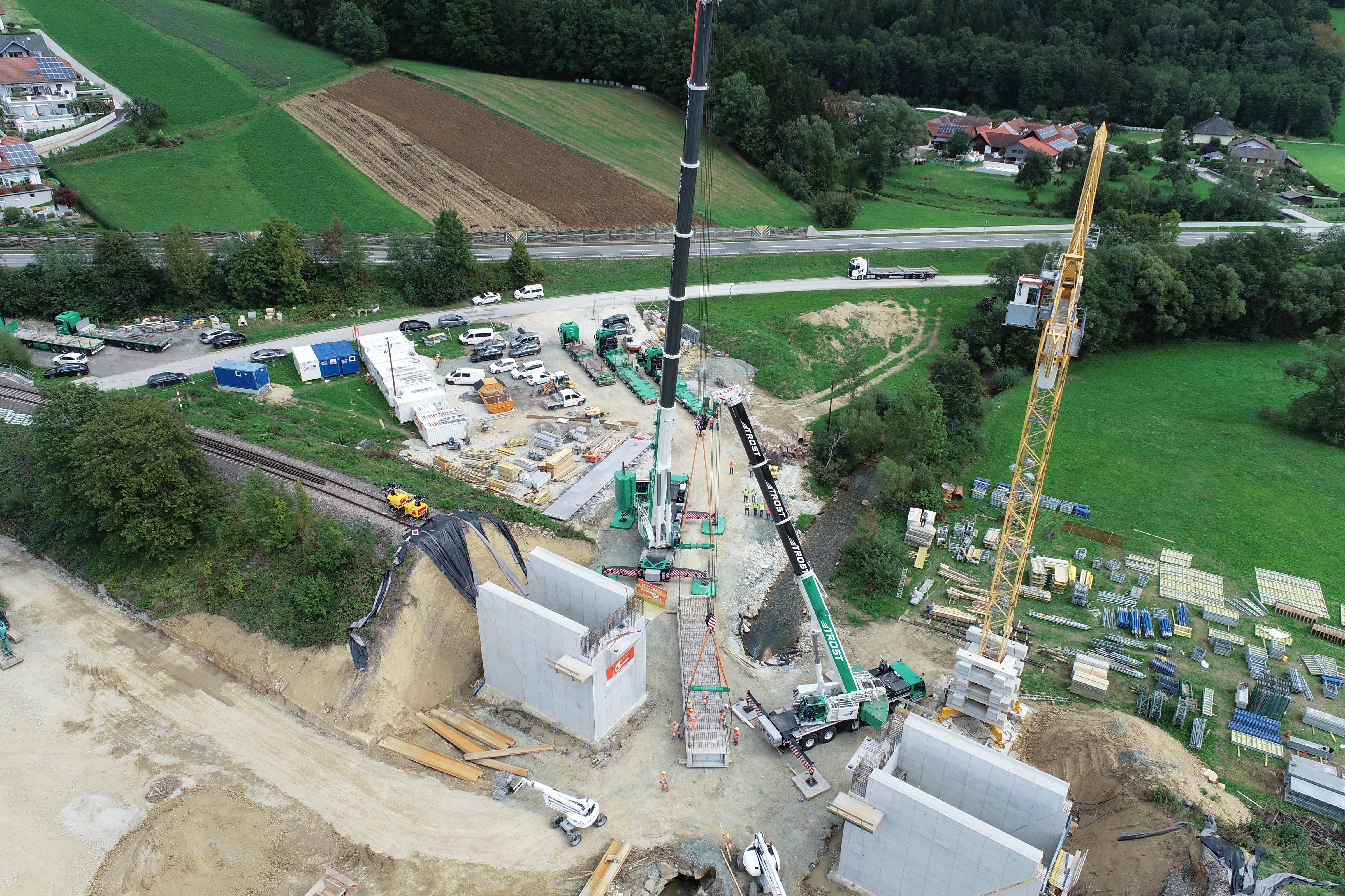 Das alte Brückentragwerk wurden abgetragen, ausgehoben und durch ein neues ersetzt. Die Bauteile für die neue Brücke waren schon im Vorhinein angefertigt, was ihr geringes Gewicht ermöglichte, und wurden anschließend wie große Bausteine eingesetzt. Für den Einhub der Fertigteile kamen zwei 450-Tonnen-Kräne zum Einsatz. Präzisionsarbeit und enormes Fingerspitzengefühl war gefragt, denn bei unsachgemäßem Anheben oder zu schnellem Hantieren können derartige Fertigteile auch zu Bruch gehen. „Die Arbeiten mussten in engsten Zeitfenstern abgewickelt werden, um Streckenunterbrechungen und damit die Behinderungen für den Zugverkehr so kurz wie möglich zu halten“, erklärt Heinz Höller, stellvertretender ÖBB-Regionalleiter. Nun ist die Brücke wieder fit für die Zukunft.