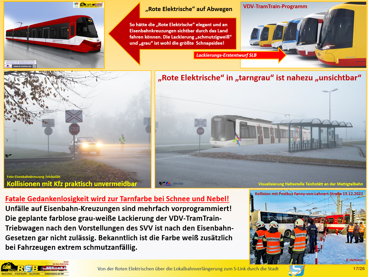 Damit die Lokalbahn als extrem lebensgefährliches Verkehrssystem abgestempelt werden kann, erklärt die „Tarnfarbe Weißgrau“ bei den neuen VDV-TramTrain-Triebwagen, die bei trüber Sicht an nebeligen Dämmerungssituationen die Züge nahezu „unsichtbar“ macht und an Eisenbahnkreuzungen so manches Auto aufspießen wird. So dumm kann man wohl nicht sein, dass man Fahrzeuge, im Wissen um das Problem, bewusst so unauffällig lackiert. Wer hat einen Nutzen daraus, dass an Eisenbahnkreuzungen regelmäßig Autos und ggf. ein Lokalbahn-Triebwagen verschrottet werden? Es ist wirklich nicht zu rechtfertigen, Menschen sterben zu lassen, nur um Landesrat Schnöll schaden zu können.