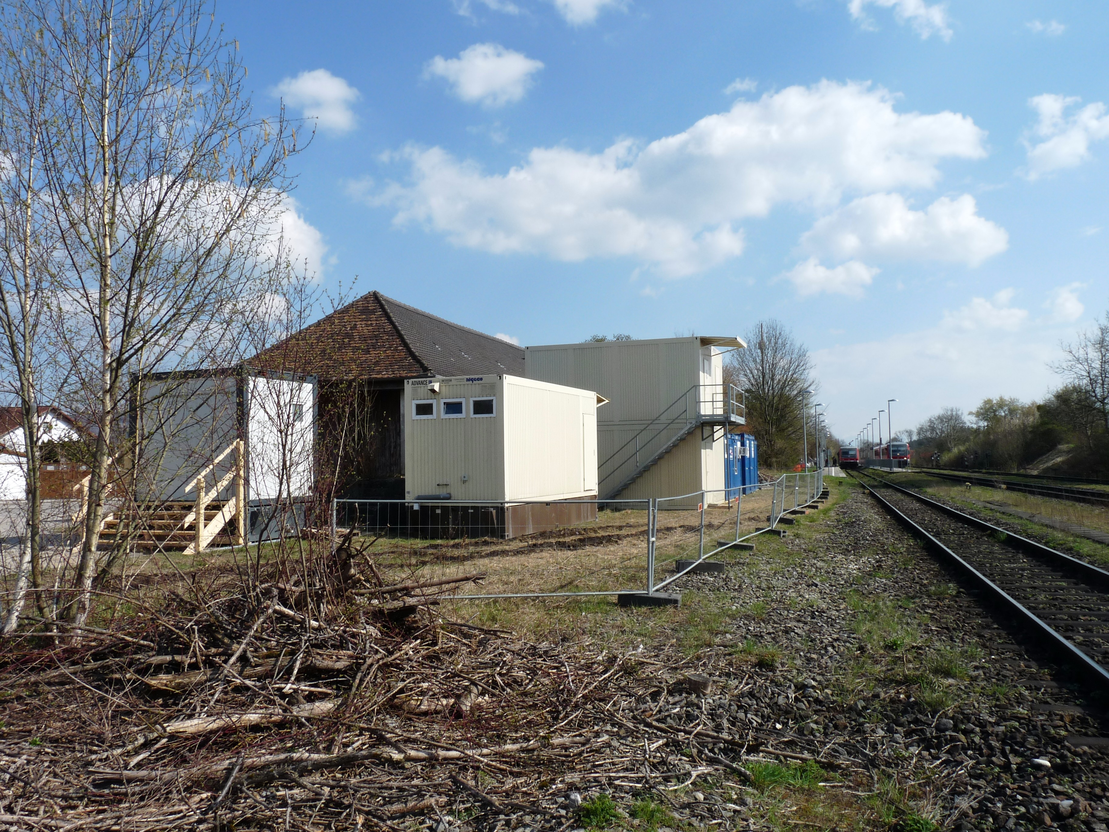 In den letzten Tagen haben die Bauarbeiten am Bahnhof Laufen begonnen. Man hat die Fläche für den oder die künftigen Stellwerkscontainer hergerichtet (Bild 7) und Container für das Baubüro, Toiletten und Gerätschaften neben der ehemaligen Stückguthalle aufgestellt (Bild 8).